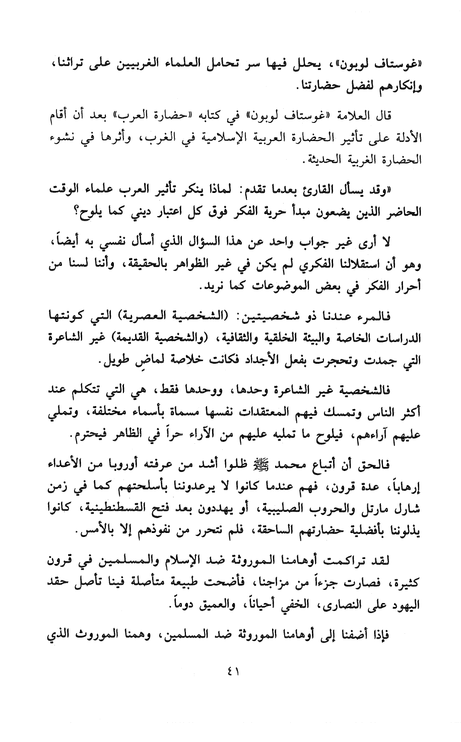 غوستاف لوبون، يحلل فيها سِرَّ تحامل العلماء الغَرْبِيِّينَ على تراثنا، وإنكارهم لفضل حضارتنا.