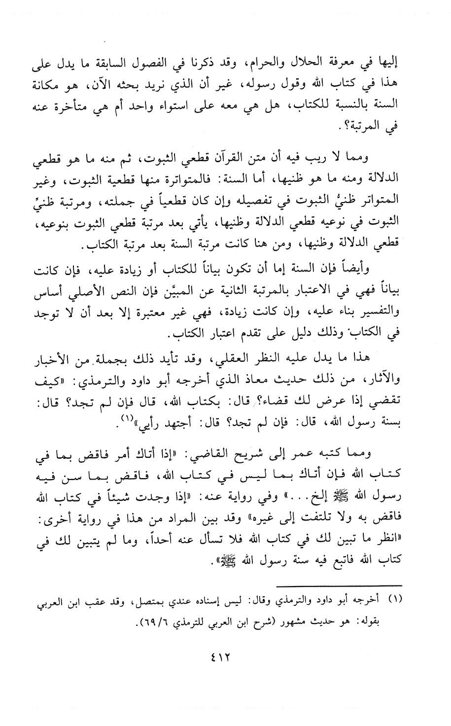 إليها في معرفة الحلال والحرام، وقد ذكرنا في الفصول السابقة ما يدل على هذا في كتاب الله وقول رسوله، غير أن الذي نريد بحثه الآن، هو مكانة السُنَّةِ بالنسبة للكتاب، هل هي معه على استواء واحد أم هي متأخرة عنه في المرتبة؟.