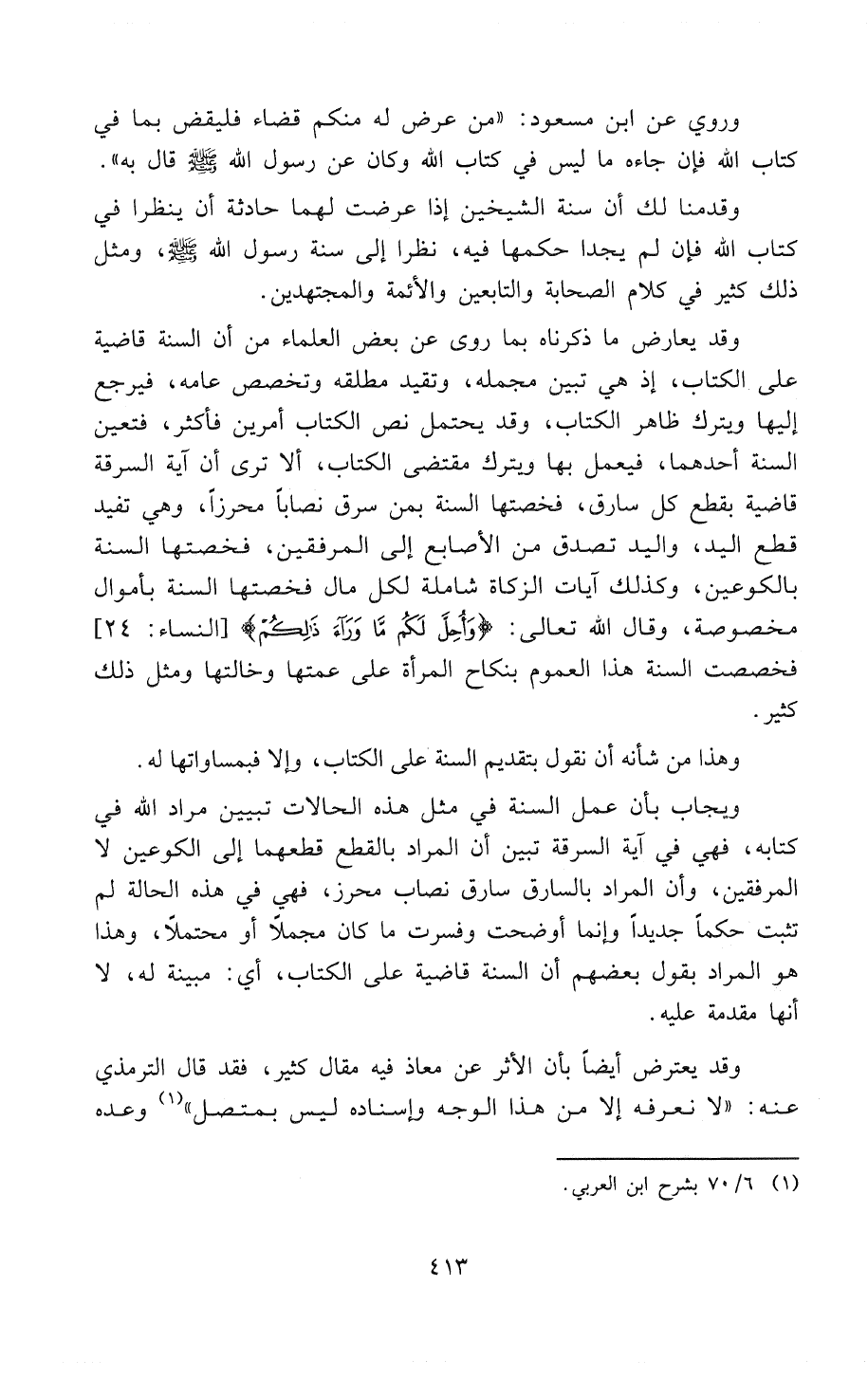 وَرُوِيَ عن ابن مسعود: «مَنْ عَرَضَ لَهُ مِنْكُمْ قَضَاءٌ فَلْيَقْضِ بِمَا فِي كِتَابِ اللَّهِ، فَإِنْ جَاءَهُ مَا لَيْسَ فِي كِتَابِ اللَّهِ [فَلْيَقْضِ بِمَا قَضَى بِهِ نَبِيُّهُ - صَلَّى اللهُ عَلَيْهِ وَسَلَّمَ -]» (*). وقدمنا لك أن سُنَّةَ الشيخين إذا عرضت لهما حادثة أن ينظرا في كتاب الله فإن لم يَجِدَا حكمها فيه، نظرا إلى سُنَّةِ رسول الله - صَلََّى اللهُ عَلَيْهِ وَسَلَّمَ -، ومثل ذلك كثير في كلام الصحابة والتا بعين والأئمة والمُجْتَهِدِينَ.