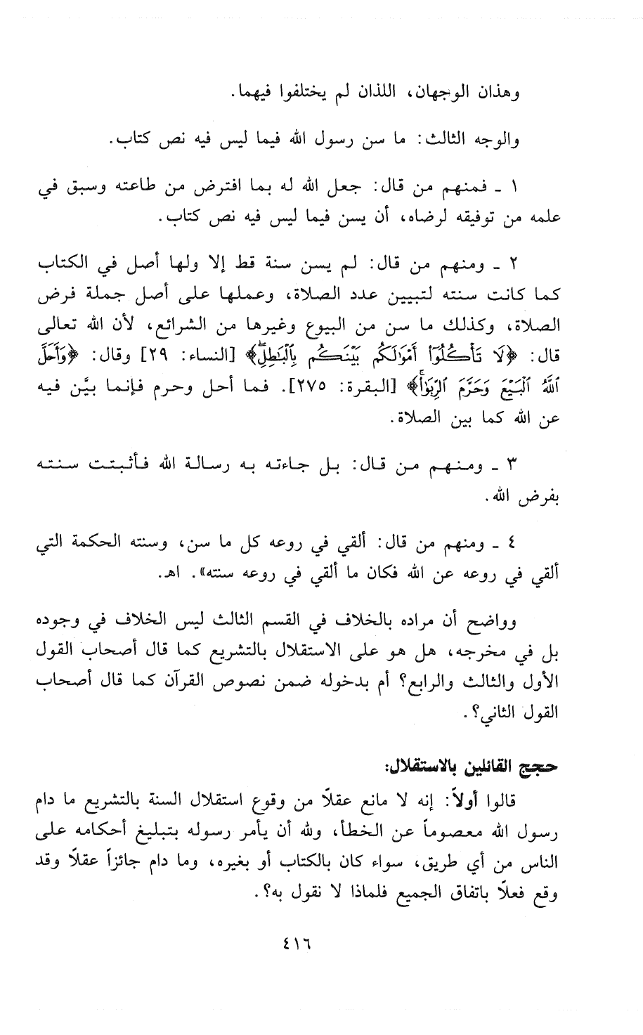 وواضح أن مراده بالخلاف في القسم الثالث ليس الخلاف في وجوده بل في مخرجه، هل هو على الاستقلال بالتشريع كما قال أصحاب القول الأول والثالث والرابع؟ أم بدخوله ضمن نصوص القرآن كما قال أصحاب القول الثاني؟.