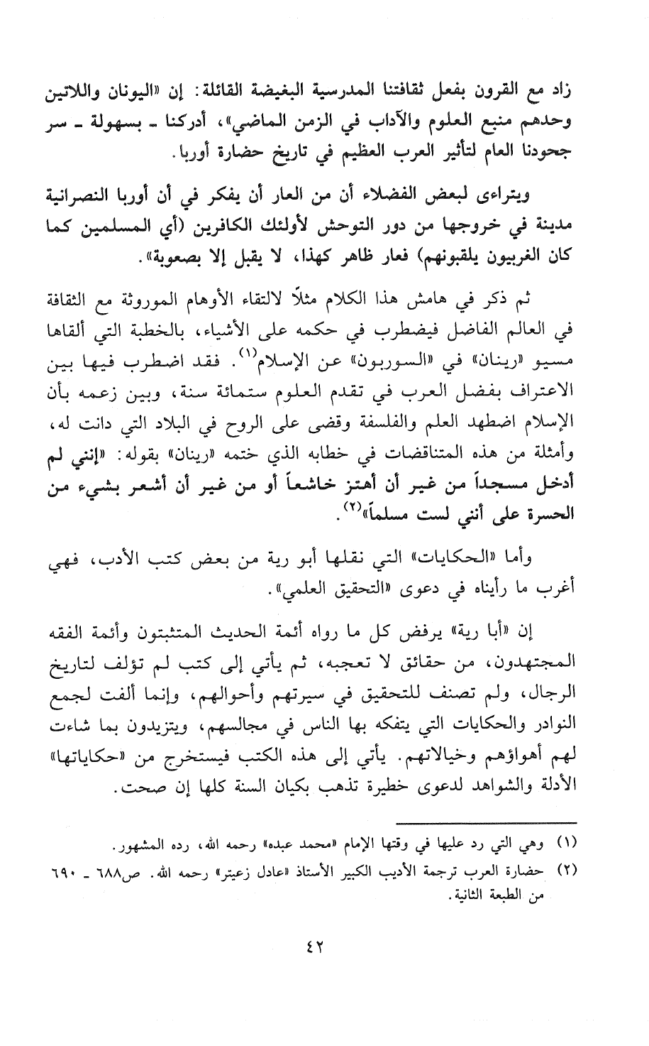ثم ذكر في هامش هذا الكلام مثلاً لالتقاء الأوهام الموروثة مع الثقافة في العالم الفاضل فيضطرب في حكمه على الأشياء، بالخطبة التي ألقاها مسيو «رِينَانْ» في «السوربون» عن الإسلام (¬1). فقد اضطرب فيها بين الاعتراف بفضل العرب في تقدم العلوم ستمائة سَنَةٍ، وبين زعمه بأن الإسلام اضطهد العلم والفلسفة وقضى على الروح في البلاد التي دانت له، وأمثلة من هذه المتناقضات في خطابه الذي ختمه «رينان» بقوله: «إِنَّنِي لَمْ أَدْخُلْ مَسْجِدًا مِنْ غَيْرِ أَنْ اهْتَزَّ خَاشِعًا أَوْ مِنْ غَيْرِ أَنْ أَشْعُرُ بِشَيْءٍ مِنَ الحَسْرَةِ عَلَى أَنَّنِي لَسْتُ مُسْلِمًا» (¬2).