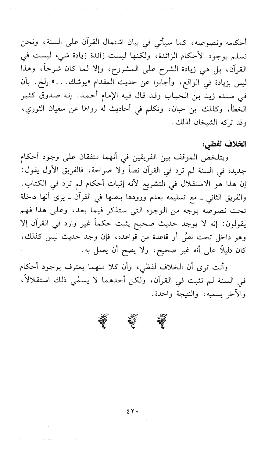 وأنت ترى أن الخلاف لفظي، وأن كُلاًّ منهما يعترف بوجود أحكام في السُنَّةِ لم تَثبُتْ في القراَن، ولكن أحدهما لا يُسَمِّي ذلك استقلالاً، والآخر يُسَمِّيهِ، والنتيجة واحدة.