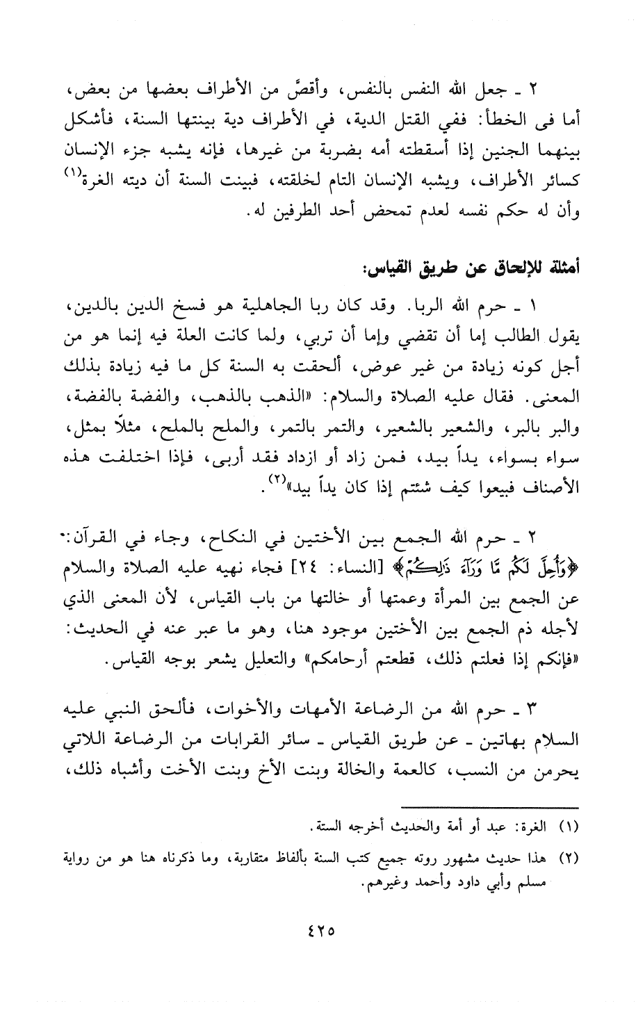 2 - حَرَّمَ اللهُ الجمع بين الأختين في النكاح، وجاء في القرآن: {وَأُحِلَّ لَكُمْ مَا وَرَاءَ ذَلِكُمْ} (¬3) فَجَاءَ نَهْيُهُ - عَلَيْهِ الصَلاَةُ وَالسَّلاَمُ - عَنْ الجَمْعِ بَيْنَ المَرْأَةِ وَعَمَّتِهَا أَوْ خَالَتِهَا من باب القياس، لأن المعنى الذي لأجله ذم الجَمْعَ بَيْنَ الأُخْتَيْنِ مَوْجُودٌ هُنَا، وهو ما عَبَّرَ عنه في الحديث: «فَإِنَّكُمْ إِذَا فَعَلْتُمْ ذَلِكَ، قَطَعْتُمْ أَرْحَامَكُمْ» والتعليل يشعر بوجه القياس.