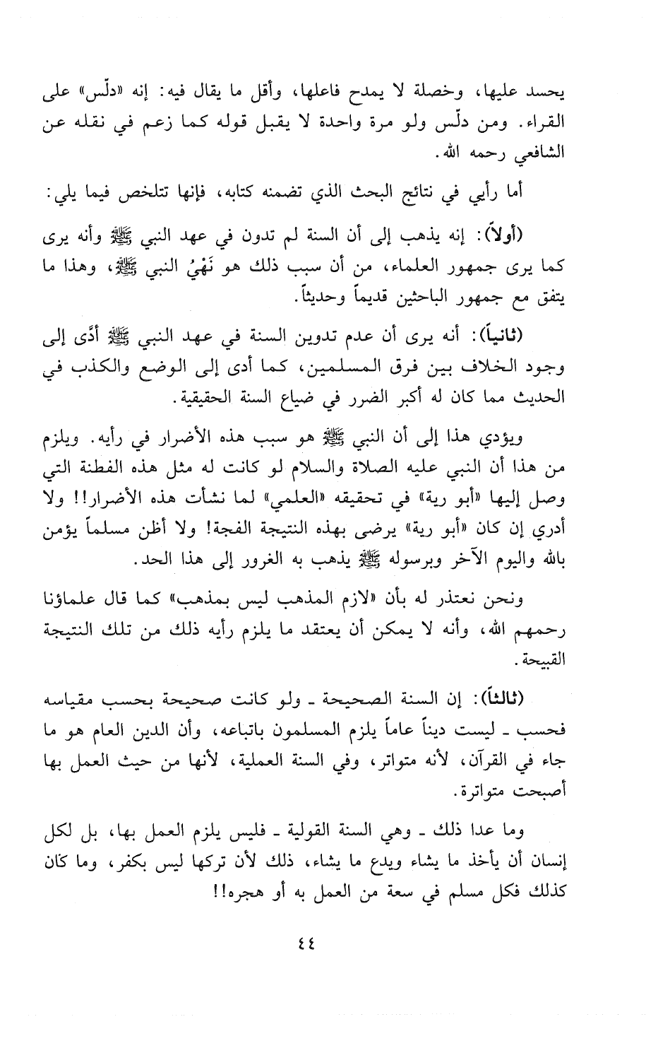 (أَوَلاً) - إنه يذهب إلى أن السُنَّةَ لَمْ تُدَوَّنْ في عهد النَّبِيِّ- صَلََّى اللهُ عَلَيْهِ وَسَلَّمَ - وأنه يرى كما يرى جمهور العلماء، من أن سبب ذلك هو نَهْيُ النَّبِيِّ - صَلََّى اللهُ عَلَيْهِ وَسَلَّمَ -، وهذا ما يتفق مع جمهور الباحثين قَدِيمًا وَحَدِيثًا.