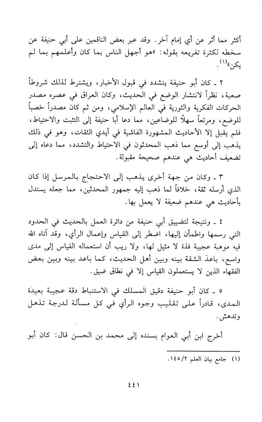 4 - ونتيجة لتضييق أبي حنيفة من دائرة العمل بالحديث في الحدود التي رسمها واطمأن إليها، اضطر إلى القياس وإعمال الرأي، وقد آتاه اللهُ فيه موهبة عجيبة فذة لا مثيل لها، ولا ريب أن استعماله القياس إلى مدى واسع، بَاعَدَ الشُقَّةَ بينه وبين أهل الحديث، كما باعد بينه وبين بعض الفقهاء الذين لايستعملون القياس إلا في نطاق ضيق.
