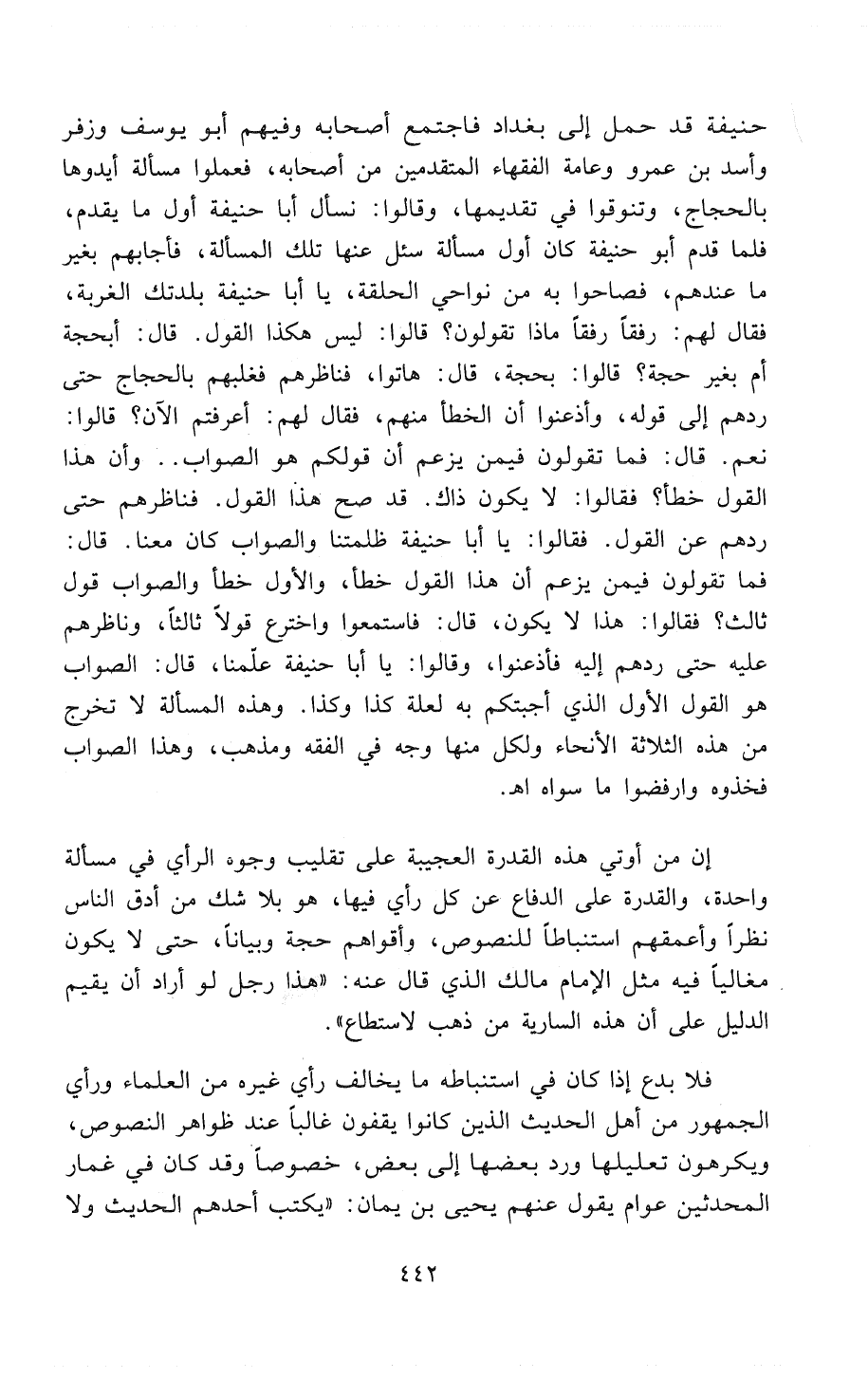 إن من أوتي هذه القدرة العجيبة على تنقيب وجوه الرأي في مسألة واحدة، والقدرة على الدفاع عن كل رأي فيها، هو بلا شك من أدق الناس نظراً وأعمقهم استنباطاً للنصوص، وأقواهم حُجَّةً وبياناً، حتى لا يكون مغالياً فيه مثل الإمام مالك الذي قال عنه: «هَذَا رَجُلٌ لَوْ أَرَادَ أَنْ يُقِيمَ الدَّلِيلَ عَلَى أَنَّ هَذِهِ السَّارِيَةِ مِنْ ذَهَبٍ لاسْتَطَاعَ».