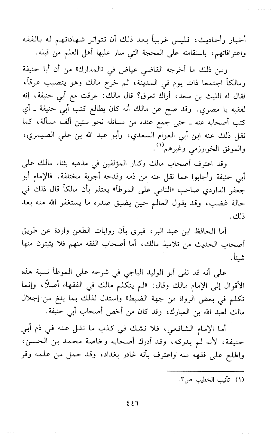 ومن ذلك ما أخرجه القاضي عياض في " المدارك " من أن أبا حنيفة ومالكاً اجتمعا ذات يوم في المدينة، ثم خرج مالك وهو يتصبب عرقاً، فقال له الليث بن سعد: «أَرَاكَ تَعْرَقُ؟» قال مالك: «عَرَقْتُ مَعَ أَبِي حَنِيفَةَ، إِنَّهُ لَفَقِيهٌ يَا مِصْرِيُّ». وقد صح عن مالك أنه كان يطالع كتب أبي حنيفة - أي كتب أصحابه عنه - حتى جمع عنده من مسائله نحو ستين ألف مسألة، كما نقل ذلك عنه ابن أبي العوام السعدي، وأبو عبد الله بن علي الصيمري، وَالمُوَّفَّقْ الخَوَارِزْمِيُّ وغيرهم (¬1).