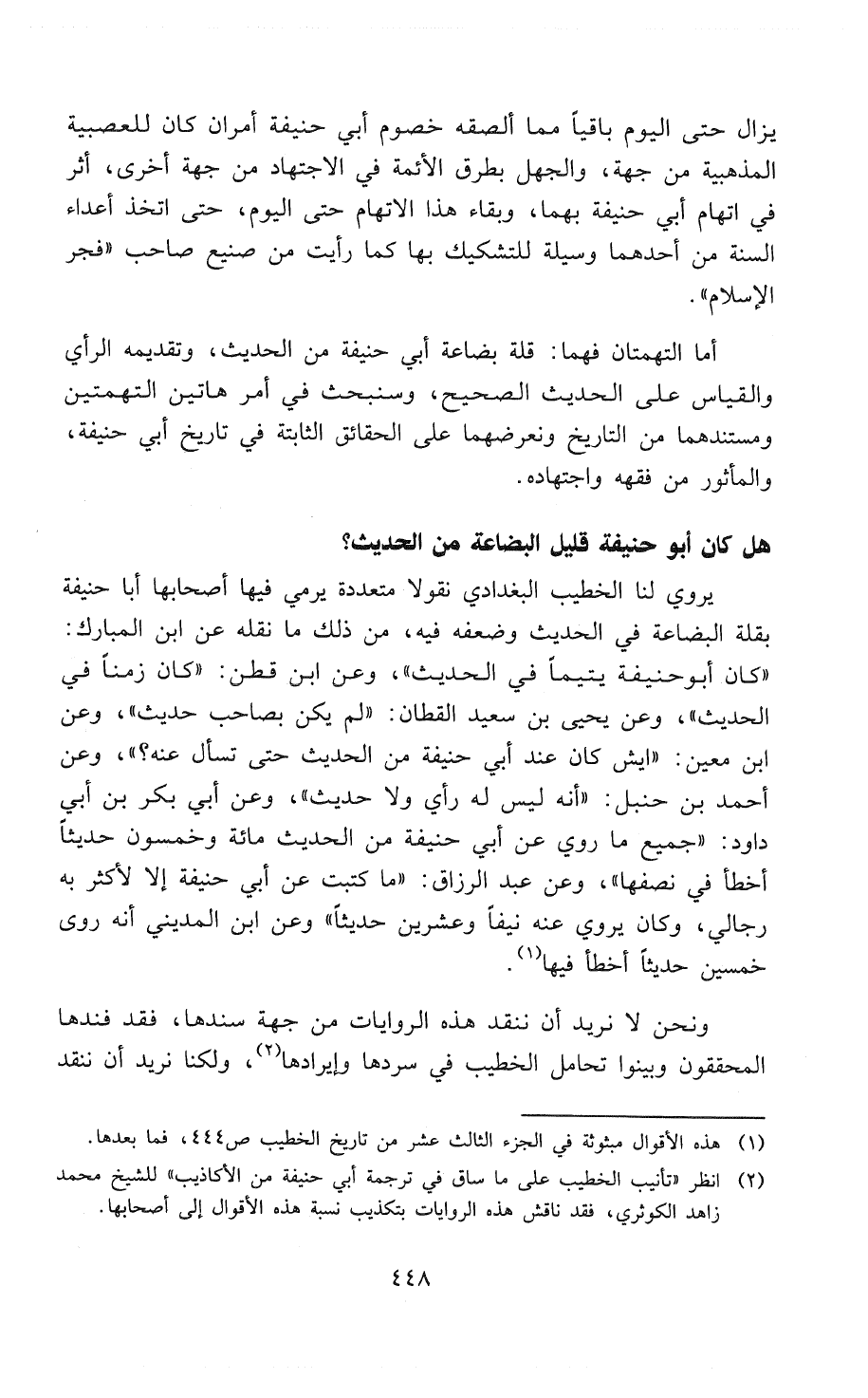 (¬2) انظر " تأنيب الخطيب على ما ساق في ترجمة أبي حنيفة من الأكاذيب " للشيخ محمد زاهد الكوثري، فقد ناقش هذه الروايات بتكذيب نسبة هذه الأقوال إلى أصحابها.