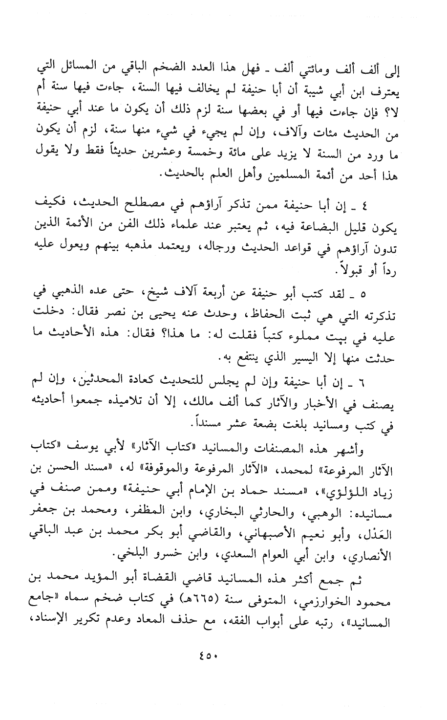 4 - إن أبا حنيفة مِمَّنْ تُذْكَرُ آراؤهم في مصطلح الحديث، فكيف يكون قليل البضاعة فيه، ثم يعتبر عند علماء ذلك الفن من الأئمة الذين تُدَوَّنُ آراؤهم في قواعد الحديث ورجاله، ويعتمد مذهبه بينهم وَيُعَوَّلُ عليه رَدًّا أو قبولا؟.