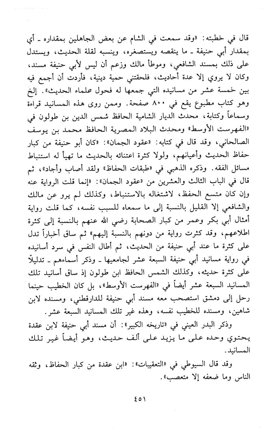 قال في خطبته: «وَقَدْ سَمِعْتُ فِي الشَّامِ عَنْ بَعْضِ الجَاهِلِيَنَ بِمِقْدَارِهِ - أَيُّ بِمِقْدَارٍ أَبِي حَنِيفَةَ - مَا يُنْقِصُهُ وَيَسْتَصْغِرُهُ، وَيَنْسِبَهُ لِقِلَّةِ الحَدِيثِ، وَيْسْتَدِلُّ عَلَىَ ذَلِكَ بِـ " مُسْنَدِ الشَّافِعِيِّ "، وَ " مُوَطَّأِ مَالِكٍ " وَزَعَمَ أَنْ لَيْسَ لأَبِي حَنِيفَةَ مُسْنَدٌ، وَكَانَ لاَ يَرْوِي إِلاَّ عِدَّةَ أَحَادِيثَ، فَلَحِقَتْنِي حَمِيَّةٌ دِينِيَّةٌ، فَأَرَدْتُ أَنْ أَجْمَعَ فِيهِ بَيْنَ خَمْسَةَ عَشَرَ مِنْ مَسَانِيدِهِ التِي جَمَعَهَا لَهُ فُحُولِ عُلَمَاءِ الحَدِيثِ.» الخ وهو كتاب مطبوع يقع في 800 صفحة. وَمِمَّنْ روى هذه المسانيد قراءة وسماعاً وكتابةً، مُحَدِّثُ الديار الشامية الحافظ شمس الدين بن طولون في " الفهرست الأوسط " وَمُحَدِّثُ البلاد المصرية الحافظ محمد بن يوسف الصالحاني، وقد قال في كتابه: " عقود الجمان ": «كَانَ أَبُو حَنِيفَةَ مِنْ كِبَارِ حُفَّاظِ الحَدِيثِ وَأَعْيَانِهِمْ، وَلَوْلاَ كَثْرَةُ اعْتِنَائِهِ بِالحَدِيثِ مَا تَهَيَّأَ لَهُ اسْتِنْبَاطِ مَسَائِلِ الفِقْهِ. وَذَكَرَهُ الذَّهَبِيُّ فِي " طَبَقَاتِ الحُفَّاظِ " وَلَقَدْ أَصَابَ وَأَجَادَ»، ثم قال في الباب الثالث والعشرين من "عقود الجمان ": «إِنَّمَا قَلَّتْ الرِّوَايَةُ عَنْهُ وَإِنْ كَانَ مُتَّسِعَ الحِفْظِ، لاشْتِغَالِهِ بِالاسْتِنْبَاطِ، وَكَذَلِكَ لَمْ يَرْوِ عَنْ مَالِكٍ وَالشَّافِعِيِِّ إِلاَّ القَلِيْلَ بِالنِّسْبَةِ إِلَىَ مَا سَمِعَاهُ لِلْسَّبَبِ نَفْسِهِ، كَمَا قَلَّتْ رِوَايَةِ أَمْثَالَ أَبِيْ بَكْرٍ وَعُمَرَ مِنْ كِبَارِ الْصَّحَابَةِ - رَضِيَ الْلَّهُ عَنْهُمْ - بِالنِّسْبَةِ إِلَىَ كَثْرَةِ اطِّلاَعِهِمْ، وَقَدْ كَثُرَتْ رِوَايَةَ مَنْ دُونَهُمْ بِالنِّسْبَةِ إِلَيْهِمْ» ثم ساق أخباراً تدل على كثرة ما عند أبي حنيفة من الحديث، ثم أطال النفس في سرد أسانيده في رواية مسانيد أبي حنيفة السبعة عشر لجامعيها - وذكر أسماءهم - تدليلاً على كثرة حديثه، وكذلك الشمس الحافظ ابن طولون إذ ساق أسانيد تلك المسانيد السبعة عشر أيضاًً في " الفهرست الأوسط "، بل كان الخطيب حينما رحل إلى دمشق استصحب معه " مسند أبي حنيفة للدارقطني "، و" مسنده لابن شاهين "، و" مسنده للخطيب " نفسه، وهذه غير تلك المسانيد السبعة عشر.