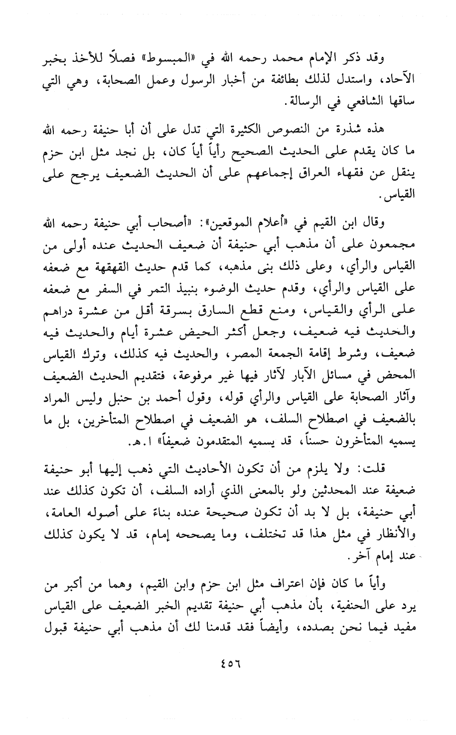 وأياً ما كان فإن اعتراف مثل ابن حزم وابن القيم، وهما من أكبر من يَرُدُّ على الحَنَفِيَّةِ، بأن مذهب أبي حنيفة تقديم الخبر الضعيف على القياس مفيد فيما نحن بصدده، وأيضاًً فقد قدمنا لك أن مذهب أبي حنيفة قبول