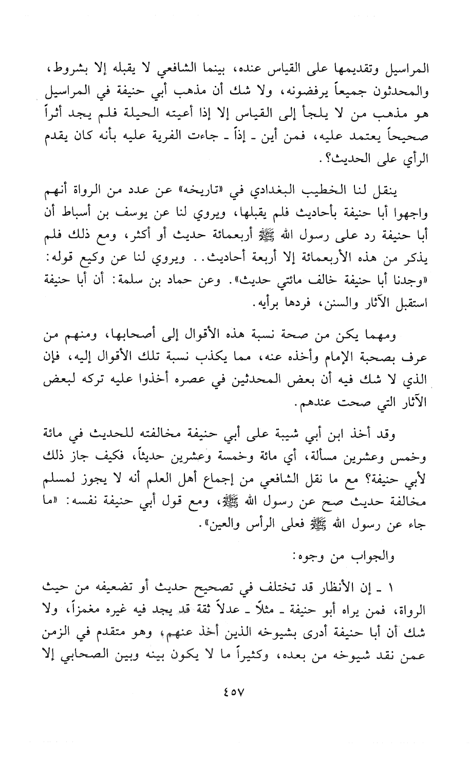 المراسيل وتقديمها على القياس عنده، بينما الشافعي لا يقبله إلا بشروط، وَالمُحَدِّثُونَ جميعاً يرفضونه، ولا شك أن مذهب أبي حنيفة في المراسيل هو مذهب من لا يلجأ إلى القياس إلا إذا أعيته الحيلة فلم يجد أثرًا صحيحاً يعتمد عليه، فمن أين - إذاً - جاءت الفرية عليه بأنه كان يُقَدِّمُ الرأي على الحديث؟.