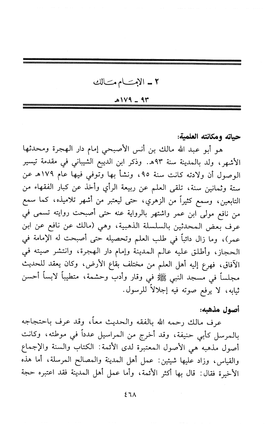 عرف مالك - رَحِمَهُ اللهُ - بالفقه والحديث معاً، وقد عرف باحتجاجه بالمرسل كأبي حنيفة، وقد أخرج من المراسيل عدداً في " موطئه "، وكانت أصول مذهبه هي الأصول المعتبرة لدى الأئمة: الكتاب وَالسُنَّةُ والإجماع والقياس، وزاد عليها شيئين: عمل أهل المدينة والمصالح المرسلة، أما هذه الأخيرة فقال: «قال بها أكثر الأئمة»، وأما عمل أهل المدينة فقد اعتبره حُجَّةً