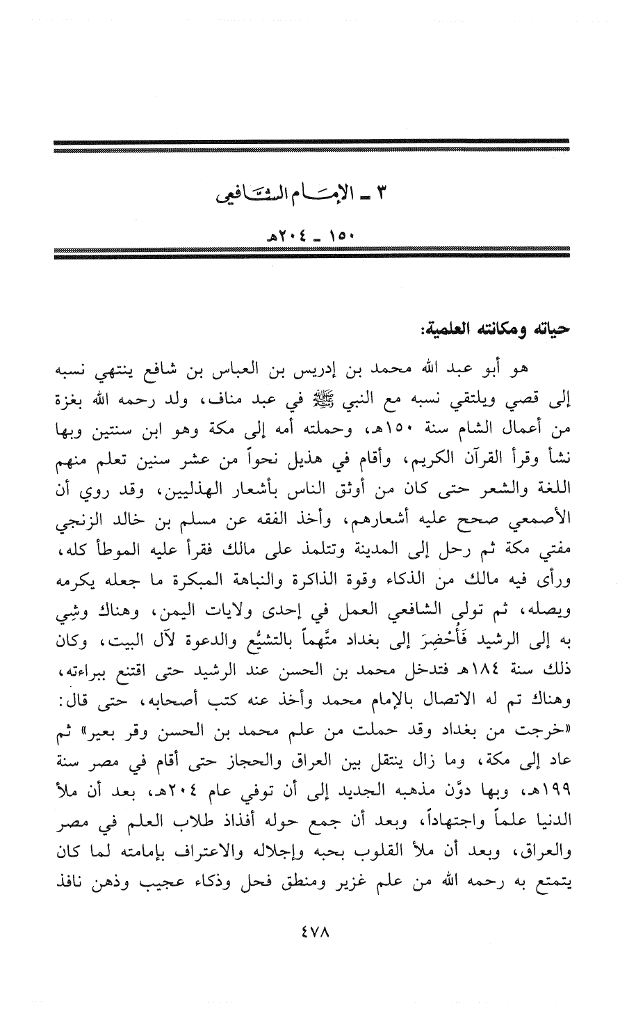 هو أبو عبد الله محمد بن إدريس بن العباس بن شافع ينتهي نسبه إلى قُصَيٍّ ويلتقي نسبه مع النَّبِيِّ - صَلََّى اللهُ عَلَيْهِ وَسَلَّمَ - في عبد مناف، ولد - رَحِمَهُ اللهُ - بِغَزَّةَ من أعمال الشام سنة 150 هـ، وحملته أمه إلى مكة وهو ابن سنتين وبها نشأ وقرأ القرآن الكريم، وأقام في هُذَيْلٍ نحواً من عشر سنين تعلم منهم اللغة والشعر حتى كان من أوثق الناس بأشعار الهذليين، وقد روي أن الأصمعي صَحَّحَ عليه أشعارهم، وأخذ الفقه عن مسلم بن خالد الزنجي مفتي مكة ثم رحل إلى المدينة وتتلمذ على مالك فقرأ عليه " المُوَطَّأ " كله، ورأى فيه مالك من الذكاء وقوة الذاكرة والنباهة المبكرة ما جعله يكرمه ويصله، ثم تولى الشافعي العمل في إحدى ولايات اليمن، وهناك وُشِيَ به إلى الرشيد فَأُحْضِرَ إلى بغداد مُتَّهَمًا بِالتَشَيُّعِ والدعوة لآل البيت، وكان ذلك سَنَةَ 184 هـ فتدخل محمد بن الحسن عند الرشيد حتى اقتنع ببراءته، وهناك تم له الاتصال بالإمام محمد وأخذ عنه كُتُبَ أصحابه، حتى قال: «خَرَجْتُ مِنْ بَغْدَادَ وَقَدْ حَمَلْتُ مِنْ عِلْمِ مُحَمَّدٍ بْنِ الحَسَنِ وَقْرَ بَعِيرٍ» ثم عاد إلى مكة، وما زال ينتقل بين العراق والحجاز حتى أقام في مصر سَنَةَ 199 هـ، وبها دَوَّنَ مذهبه الجديد إلى أن توفي عام 204 هـ، بعد أن ملأ الدنيا علماً وَاجْتِهَادًا، وبعد أن جمع حوله أفذاذ طلاب العلم في مصر والعراق، وبعد أن ملأ القلوب بحبه وإجلاله والاعتراف بإمامته لما كان يتمتع به - رَحِمَهُ اللهُ - من علم غزير ومنطق فحل وذكاء عجيب وذهن نافذ