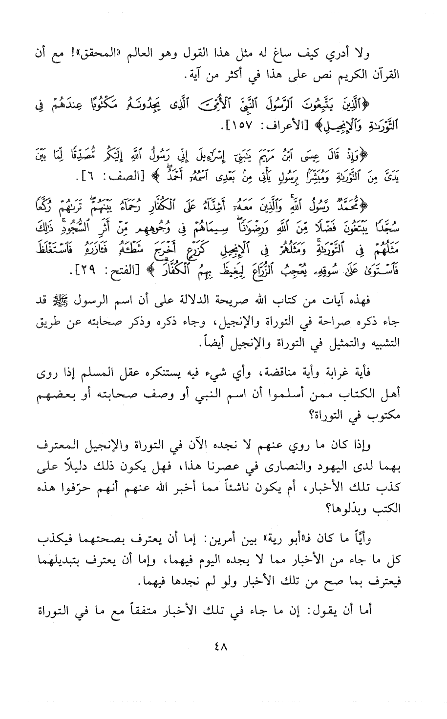 فأية غرابة وأية مناقضة، وأي شيء فيه يستنكره عقل المسلم إذا روى أهل الكتاب مِمَّنْ أسلموا أن اسم النَّبِيِّ أو وصف صحابته أو بعضهم مكتوب في التوراة؟