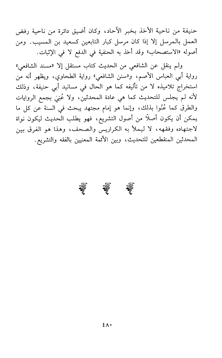 حنيفة من ناحية الأخذ بخبر الآحاد، وكان أضيق دائرة من ناحية رفض العمل بالمرسل إلا إذا كان مرسل كبار التَّابِعِينَ كسعيد بن السيب. ومن أصوله «الاستصحاب» وقد أخذ به الحَنَفِيَّةُ في الدفع لا في الإثبات.