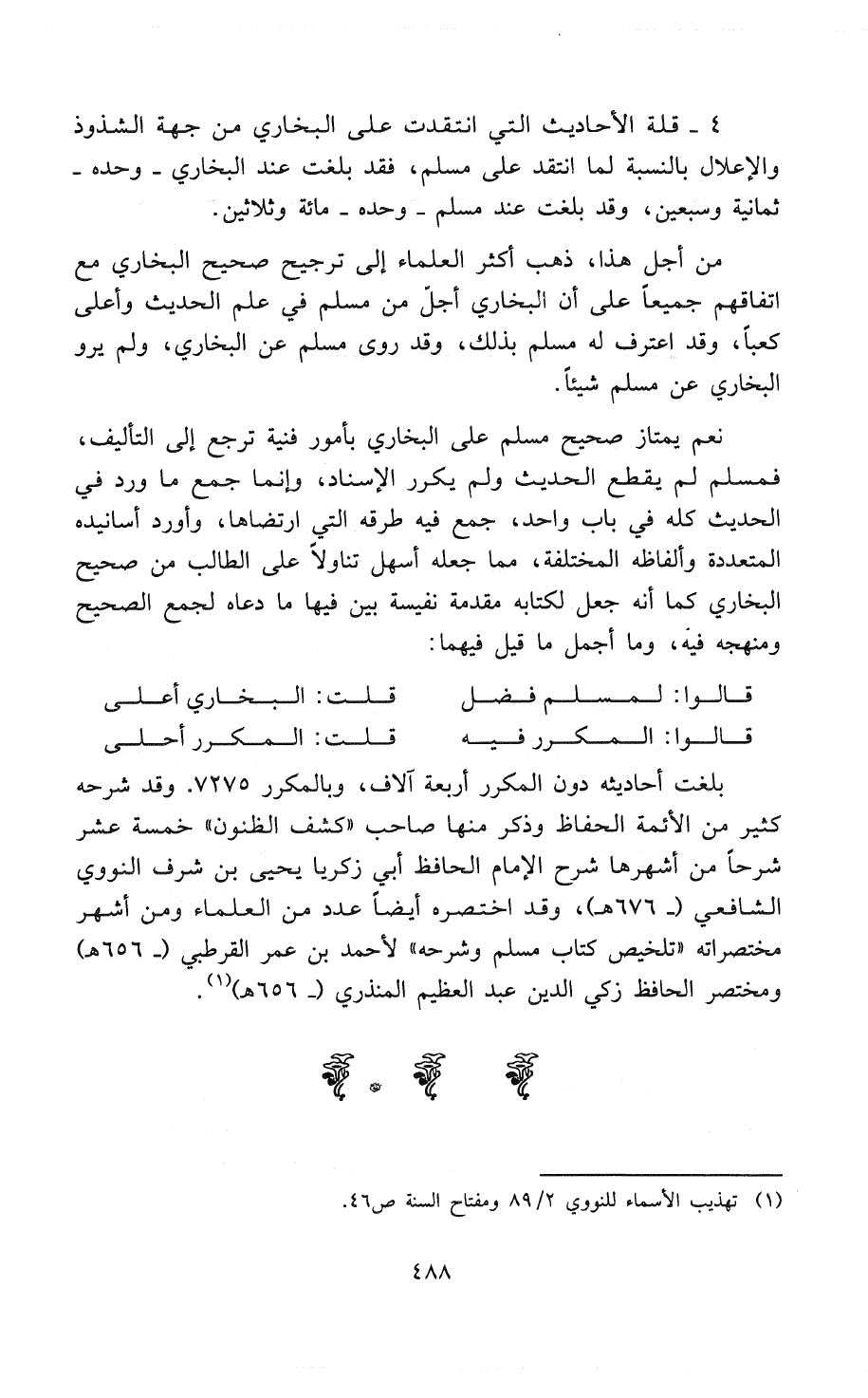 4 - قلة الأحاديث التي انتقدت على " البخاري " من جهة الشذوذ والإعلال بالنسبة لما انتقد على " مسلم "، فقد بلغت عند " البخاري " - وحده - ثمانية وسبعين، وقد بلغت عند " مسلم " - وحده - مائة وثلاثين.