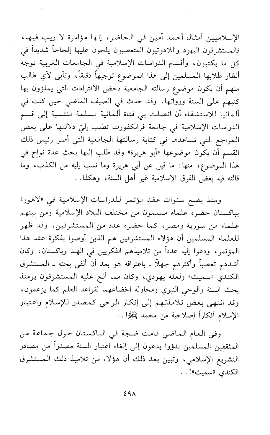 ومنذ بضع سنوات عقد مؤتمر للدرسات الإسلامية في «لاهور» بباكستان حضره علماء مسلمون من مختلف البلاد الإسلامية ومن بينهم علماء من سورية ومصر، كما حضره عدد من المُسْتَشْرِقِينَ، وقد ظهر للعلماء المُسْلِمِينَ أن هؤلاء المُسْتَشْرِقِينَ هم الذين أوصوا بفكرة عقد هذا المؤتمر، ودعوا إليه عدداً من تلاميذهم الفكريين في الهند وباكستان، وكان أشدهم تعصباً وأكثرهم جهلاً - باعترافه هو بعد أن ألقى بحثه - المستشرق الكندي «سْمِيثْ» ولعله يهودي، وكان مِمَّا أَلَحَّ عليه المُسْتَشْرِقُونَ يومئذ بحث السُنّةِ والوحي النبوي ومحاولة اخضاعهما لقواعد العلم كما يزعمون، وقد انتهى بعض تلامذتهم إلى انكار الوحي كمصدر للإسلام واعتبار الإسلام أفكاراً إصلاحية من مُحَمَّدٍ - صَلََّى اللهُ عَلَيْهِ وَسَلَّمَ -! ..