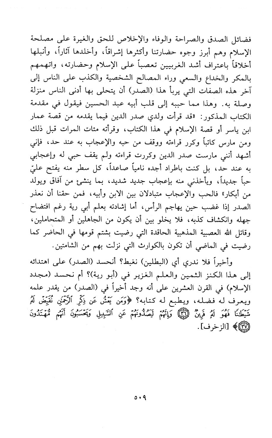 فضائل الصدق والصراحة والوفاء والإخلاص للحق والغيرة على مصلحة الإسلام وهم أبرز وجه حضارتنا وأكثرها إشراقاً، وأخلدها آثاراً، وأنبلها أخلاقاً باعتراف أشد الغَرْبِيِّينَ تعصباً على الإسلام وحضارته، واتهمهم بالمكر والخداع والسعي وراء المصالح الشخصية والكذب على الناس إلى آخر هذه الصفات التي يربأ هذا (الصدر) أن يَتَحلَّى بها أدنى الناس منزلة وصلة به. وهذا مِمَّا حَبَّبَهُ إلى قلب أبيه عَبْد الحُسَيْن فيقول في مقدمة كتابه المذكور: «قد قرأتُ ولدي صدر الدين فيما يقدمه من قصة عمار بن ياسر أو قصة الإسلام في هذا الكتاب، وقرأته مئات المرات قبل ذلك ومن مارس كاتباً وَكَرَّرَ قراءته ووقف من حبه والإعجاب به عند حد، فإني أشهد أنني مارستُ صدر الدين وكرَّرْتُ قراءته ولم يقف حُبِّي له وإعجابي به عند حد، بل كنتُ بإطراد أجده نامياً صاعداً، كل سطر منه يفتح عَلَيَّ حُبّاً جديداً، ويأخذني منه بإعجاب جديد شديد، بما ينشئ من آفاق ويولد من أبكار» فالحب والإعجاب متبادلان بين الابن وأبيه، فمن حقنا أن نعذر الصدر إذا غضب حين يهاجم الرأس، أما إشادته بعلم أَبِي رَيَّةَ رغم افتضاح جهله وانكشاف كذبه، فلا يخلو بين أن يكون من الجاهلين أوالمتحاملين، وقاتل الله العصبية المذهبية الحاقدة التي رضيت بشتم قومها في الحاضر كما رضيت في الماضي أن تكون بالكوارث التي نزلت بهم من الشامتين.