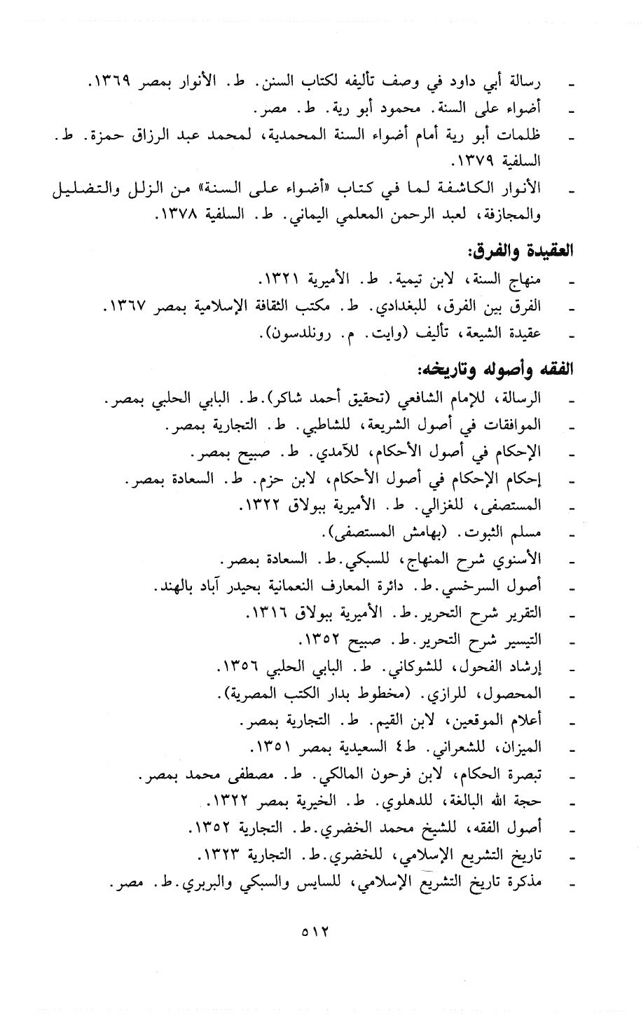 - " الرسالة "، للإمام الشافعي (تحقيق أحمد شاكر). ط. البابي الحلبي بمصر.