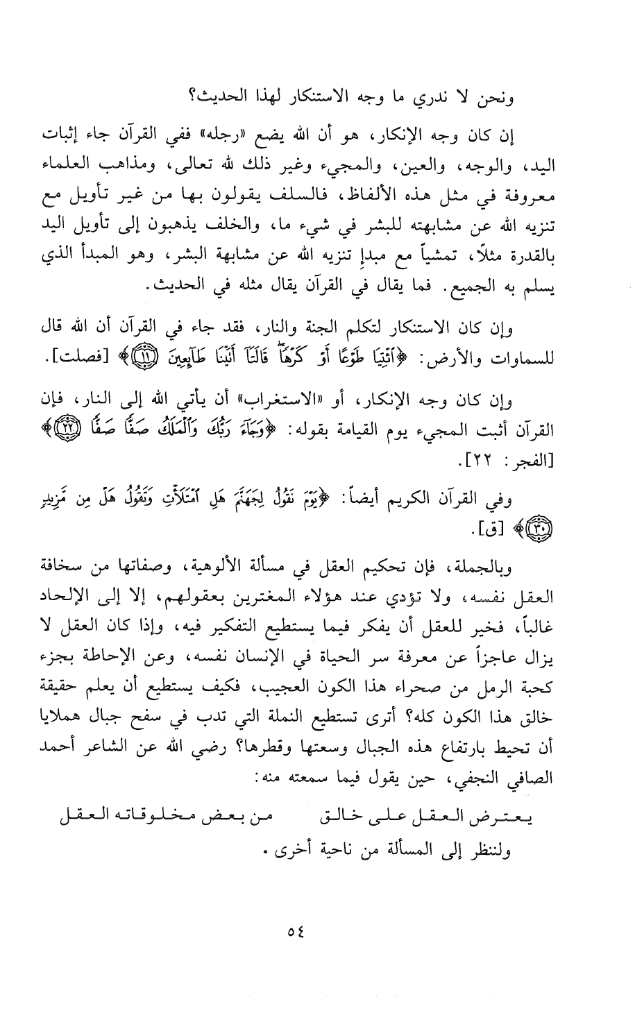 وبالجملة، فإن تحكيم العقل في مسألة الألوهية، وصفاتها من سخافة العقل نفسه، ولا تُؤَدِّي عند هؤلاء المغترين بعقولهم، إلا إلى الإلحاد غالباً، فَخَيْرٌ للعقل أن يُفَكِّرَ فيما يستطيع التفكير فيه، وإذا كان العقل لا يزال عاجزاً عن معرفة سِرِّ الحياة في الإنسان نفسه، وعن الإحاطة بجزء كحبة الرمل من صحراء هذا الكون العجيب، فكيف يستطيع أن يعلم حقيقة خالق هذا الكون كله؟ أترى تستطيع النملة التي تدب في سفح جبال هملايا أن تحيط بارتفاع هذه الجبال وسعتها وقطرها؟ رضي الله عن الشاعر أحمد الصافي النجفي، حين يقول فيما سمعته منه: