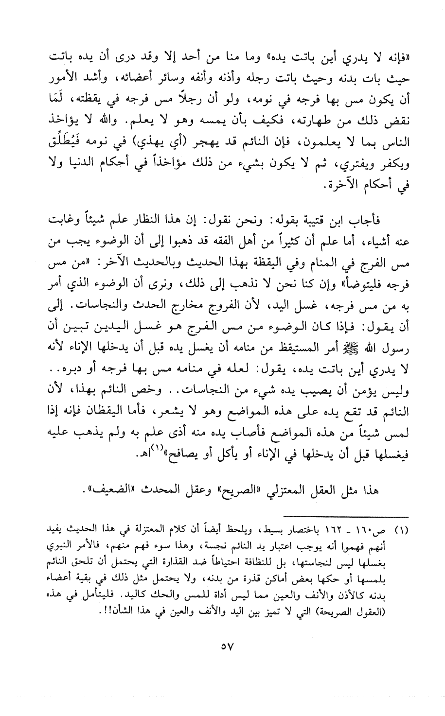 (¬1) ص 160 - 162 باختصار بسيط. ويلحظ أيضاً أن كلام المعتزلة في هذا الحديث يفيد أنهم فهموا أنه يوجب اعتبار يد النائم نجسة، وهذا سوء فهم منهم، فالأمر النبوي بغسلها ليس لنجاستها، بل للنظافة احتياطا ضد القذارة التي يحتمل أن تلحق النائم بلمسها أو حَكِّهَا بعض أماكن قذرة من بدنه، ولا يحتمل مثل ذلك في بقية أعضاء بدنه كالأذن والأنف والعين مِمَّا ليس أداة للمس والحك كاليد. فليتأمل في هذه (العقول الصريحة) التي لا تميز بين اليد والأنف والعين في هذا الشأن!!.