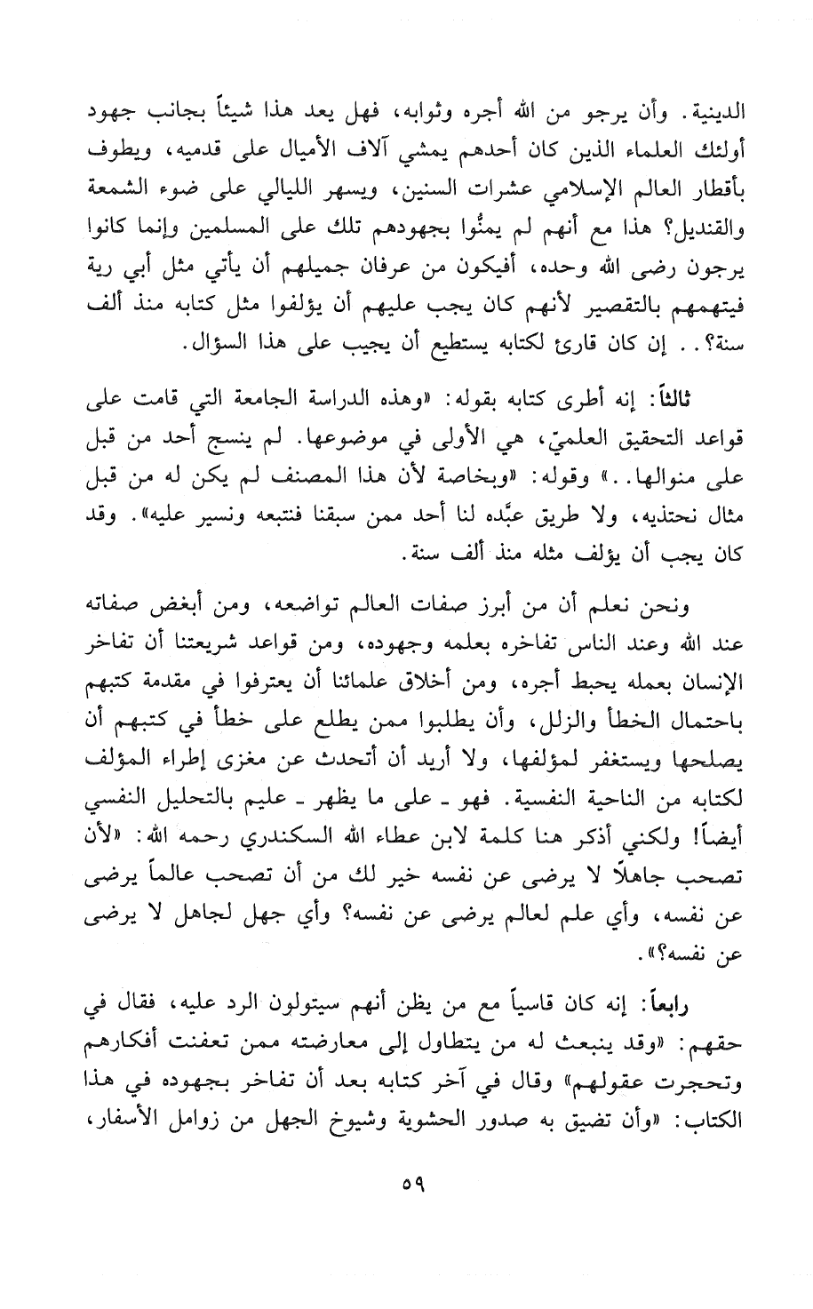 ونحن نعلم أن من أبرز صفات العالم تواضعه، ومن أبغض صفاته عند الله وعند الناس تفاخره بعلمه وجهوده، ومن قواعد شريعتنا أن تفاخر الإنسان بعمله يحبط أجره، ومن أخلاق علمائنا أن يعترفوا في مقدمة كتبهم باحتمال الخطأ والزلل، وأن يطلبوا مِمَّنْ يَطَّلِعُ على خطأ في كتبهم أن يصلحها ويستغفر لمؤلفها، ولا أريد أن أتحدث عن مغزى إطراء المؤلف لكتابه من الناحية النفسية. فهو - على ما يظهر - عليم بالتحليل النفسي أيضاً،! ولكني أذكر هنا كلمة لابن عطاء الله السكندري - رَحِمَهُ اللهُ -: «لأَنْ تَصْحَبَ جَاهِلاً لاَ يَرْضَىَ عَنْ نَفْسِهِ خَيْرٌ لَكَ مِنْ أَنْ تَصْحَبَ عَالِمًا يَرْضَىَ عَنْ نَفْسِهِ، وَأَيُّ عِلْمٍ لِعَالِمٍ يَرْضَىَ عَنِ نَفْسِهِ؟ وَأَيُّ جَهْلٍ لِجَاهِلٍ لاَ يَرْضَىَ عَنِ نَفْسِهِ؟».