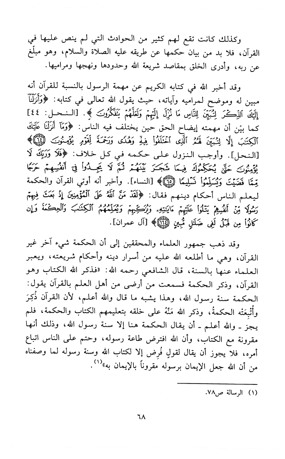 وقد ذهب جمهور العلماء وَالمُحَقِّقِينَ إلى أن الحكمة شيء آخر غير القرآن، وهي ما أطلعه الله عليه من أسرار دينه وأحكام شريعته، ويعبر العلماء عنها بِالسُنَّةِ، قال الشافعي - رَحِمَهُ اللهُ -: «فَذَكَرَ اللهُ الكِتَابَ وَهُوَ القُرْآنُ، وَذَكَرَ الحِكْمَةَ فَسَمِعْتُ مَنْ أُرْضَى مِنْ أَهْلِ العِلْمِ بِالقُرْآنِ يَقُولُ: " الحِكْمَةُ سُنََّةُ رَسُولِ اللهِ "، وَهَذَا يُشْبِهُ مَا قَالَ وَاللهُ أَعْلَمُ، لأَنََّ القُرْآنَ ذُكِرَ وَأُتْبِعَتْهُ الحِكْمَةَ، وَذَكَرَ اللهُ مَنَّهُ عَلَىَ خَلْقِهِ بِتَعْلِيمِهِمْ الكِتَابَ وَالحِكْمَةَ، فَلَمْ يَجُزْ - وَاللهُ أَعْلَمُ - أَنْ يُقَالَ الحِكْمَةُ هُنَا إِلاَّ سُنَّةَ رَسُولِ اللهِ، وَذَلِكَ أَنَّهَا مَقْرُونَةٌ مَعَ الكِتَابِ، وَأَنَّ اللهَ افْتَرَضَ طَاعَةَ رَسُولِهِ، وَحَتَّمَ عَلَى النَّاسِ اتِّبَاعَ أَمْرِهِ، فَلاَ يَجُوزُ أَنْ يُقَالَ لِقَوْلٍ، فُرِضَ إِلاَّ لِكِتَابِ اللهِ وَسُنَّةِ رَسُولِهِ لِمَا وَصَفْنَاهُ مِنْ أَنََّ اللهَ جَعَلَ الإِيمَانَ مَقْرُونًا بِالإِيمَانِ بِهِ» (¬5).