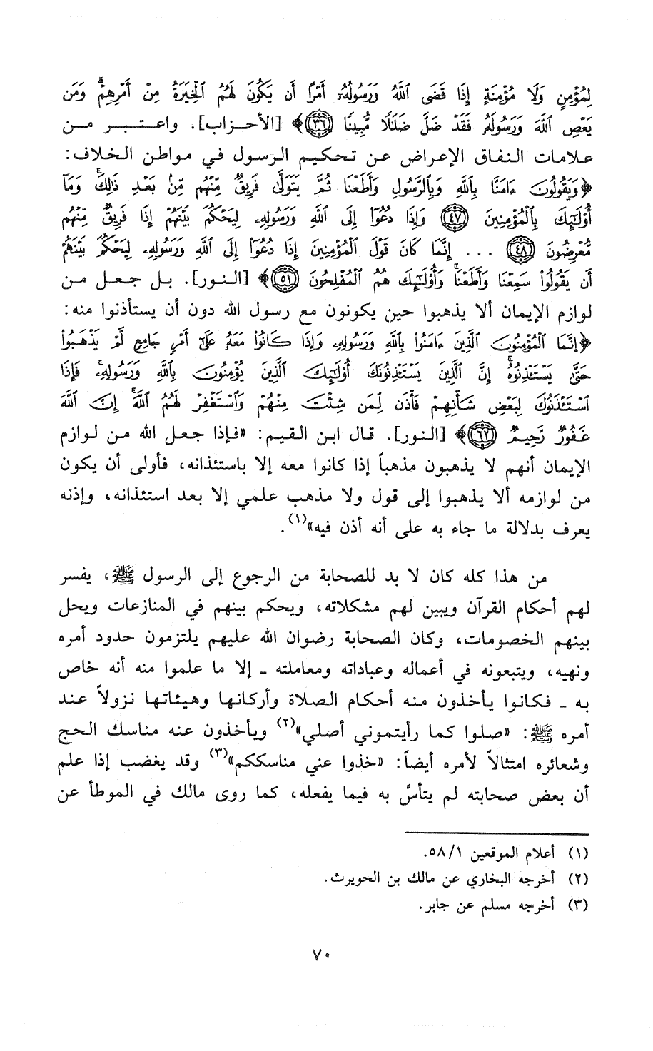 من هذا كله كان لاَ بُدَّ للصحابة من الرجوع إلى الرسول - صَلََّى اللهُ عَلَيْهِ وَسَلَّمَ -، يُفَسِّرُ لهم أحكام القرآن وَيُبَيِّنُ لهم مشكلاته، ويحكم بينهم في المنازعات ويحل بينهم الخصومات، وكان الصحابة - رِضْوَانُ اللهِ عَلَيْهِمْ - يلتزمون حدود أمره ونهيه، وَيَتَّبِعُونَهُ في أعماله وعباداته ومعاملاته - إلا ما علموا منه أنه خاص به - فكانوا يأخذون منه أحكام الصلاة وأركانها وهيئاتها نزولاً عند أمره - صَلََّى اللهُ عَلَيْهِ وَسَلَّمَ - «صَلُّوا كَمَا رَأَيْتُمُونِي أُصَلِّي» (¬5) ويأخذون عنه مناسك الحج وشعائره امتثالاً لأمره أيضاً «خُذُوا عَنِّى مَنَاسِكَكُمْ» (¬6) وقد يغضب إذا علم أن بعض صحابته لَمْ يَتَأَسَّ به فيما يفعله، كما روى مالك في " الموطأ " عَنْ