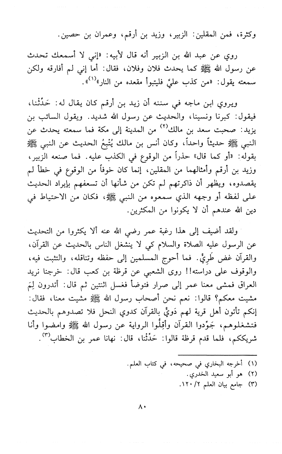وَيَرْوِي ابْنُ مَاجَهْ فِي " سُنَنِهِ " أَنَّ زَيْدَ بْنَ أَرْقَمَ كَانَ يُقَالُ لَهُ: حَدِّثْنَا، فَيَقُولُ: «كَبِرْنَا وَنَسِيَنَا، وَالحَدِيثُ عَنْ رَسُولِ اللهِ شَدِيدٌ». وَيَقُولُ السَّائِبُ بْنُ يَزِيدٍ: «صَحِبْتُ سَعْدَ بْنَ مَالِكٍ (¬2) مِنَ المَدِينَةِ إِلَى مَكَّةَ فَمَا سَمِعْتُهُ يُحَدِّثُ عَنْ النَّبِيِّ- صَلََّى اللهُ عَلَيْهِ وَسَلَّمَ - حَدِيثًا وَاحِداً»، وكان أنس بن مالك يُتْبِعُ الحديث عَنْ النَّبِيِّ - صَلََّى اللهُ عَلَيْهِ وَسَلَّمَ - بقوله: «أَوْ كَمَا قَالَ» حَذَرًا مِنَ الوُقُوعِ فِي الكَذِبِ عَلَيْهِ. فما صنعه الزبير وزيد بن أرقم وأمثالهما من المُقِلِّينَ، إنما كان خَوْفًا من الوقوع في خطأ لم يقصدوه، ويظهر أن ذاكرتهم لم تكن من شأنها أن تسعفهم بإيراد الحديث على لفظه أو وجهه الذي سمعوه من النَّبِيِّ - صَلََّى اللهُ عَلَيْهِ وَسَلَّمَ -، فكان من الاحتياط في دين الله عندهم أن لا يكونوا من المُكْثِرِينَ.