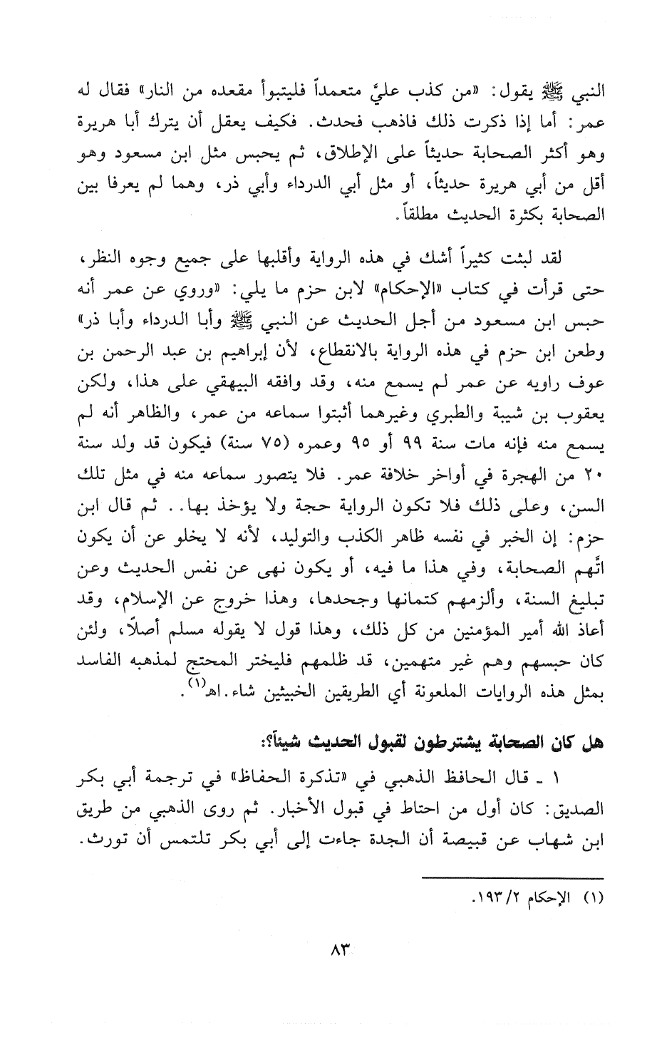 النَّبِيَّ - صَلََّى اللهُ عَلَيْهِ وَسَلَّمَ - يقول: «مَنْ كَذَبَ عَلَىَّ مُتَعَمِّدًا فَلْيَتَبَوَّأْ مَقْعَدَهُ مِنَ النَّارِ»، فَقَالَ لَهُ عُمَرُ: أَمَّا إِذَا ذَكَرْتَ ذَلِكَ فَاذْهَبْ فَحَدِّثْ». فكيف يعقل أن يترك أبا هريرة وهو أكثر الصحابة حَدِيثًا على الإطلاق، ثم يحبس مثل ابن مسعود وهو أقل من أبي هريرة حَدِيثًا، أو مثل أبي الدرداء وأبي ذر، وهما لم يُعْرَفَا بين الصحابة بكثرة الحديث مطلقاً.