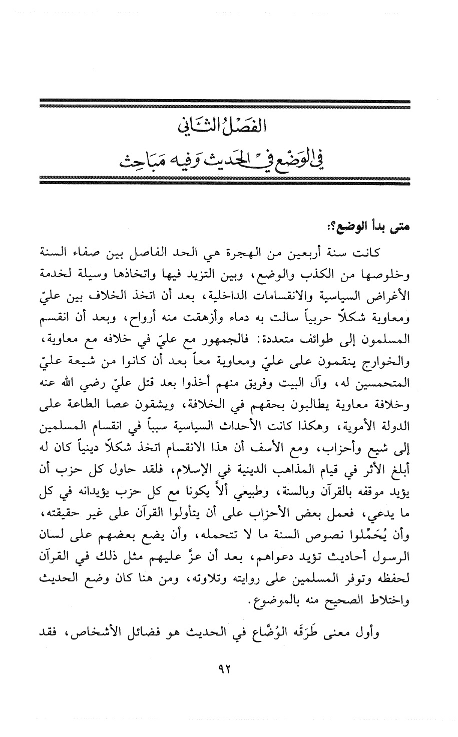 كانت سَنَة أربعين من الهجرة هي الحد الفاصل بين صفاء السُنّة وخلوصها من الكذب والوضع، وبين التزيد فيها واتخاذها وسيلة لخدمة الأغراض السياسية والانقسامات الداخلية، بعد أن اتخذ الخلاف بين عليّ ومعاوية شكلاً حربيا سالت به دماء وأزهقت منه أرواح، بعد أن انقسم المسلمون إلى طوائف متعددة: فالجمهور مع عليّ في خلافه مع معاوية، والخَوَارِج ينقمون على عليّ ومعاوية معاً بعد أن كانوا من شِيعَة عليّ المتحمسين له، وآل البيت وفريق منهم أخذوا بعد قتل عليّ - رَضِيَ اللهُ عَنْهُ - وخلافة معاوية يطالبون بحقهم في الخلافة، ويشقون عصا الطاعة على الدولة الأموية، وهكذا كانت الأحداث السياسية سبباً في انقسام المسلمين إلى شيع وأحزاب، ومع الأسف أن هذا الانقسام اتخذ شكلاً دينيا كان له أبلغ الأثر في قيام المذاهب الدينية في الإسلام، فلقد حاول كل حزب أن يؤيد موقفه بالقرآن وبالسُنّة، وطبيعي ألاََّّ يكونا مع كل حزب يؤيدانه في كل ما يدعى، فعمل بعض الأحزاب على أن يتأولوا القرآن على غير حقيقته، وأن يُحًمِّلُوا نصوص السُنّة ما لا تتحمَّلُه، وأن يضع بعضهم على لسان الرسول أحاديث تؤيد دعواهم، بعد أن عزَّ عليهم مثل ذلك في القرآن لحفظه وتوفر المسلمين على روايته وتلاوته، ومن هنا كان وضع الحديث واختلاط الصحيح منه بالموضوع.