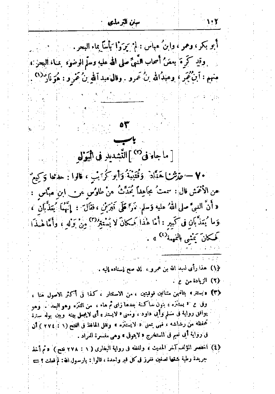 70 - حَدَّثَنَا هَنَّادٌ، وَقُتَيْبَةُ، وَأَبُو كُرَيْبٍ، قَالُوا: حَدَّثَنَا وَكِيعٌ، عَنْ الأَعْمَشِ، قَال: سَمِعْتُ مُجَاهِدًا يُحَدِّثُ، عَنْ طَاوُسٍ، عَنْ ابْنِ عَبَّاسٍ، أَنَّ النَّبِيَّ صَلَّى اللَّهُ عَلَيْهِ وَسَلَّمَ مَرَّ عَلَى قَبْرَيْنِ، فَقَالَ: " §إِنَّهُمَا يُعَذَّبَانِ، وَمَا يُعَذَّبَانِ فِي كَبِيرٍ: أَمَّا هَذَا فَكَانَ لَا يَسْتَتِرُ مِنْ بَوْلِهِ، وَأَمَّا هَذَا فَكَانَ يَمْشِي بِالنَّمِيمَةِ "، -[103]- وَفِي البَابِ عَنْ أَبِي هُرَيْرَةَ، وَأَبِي مُوسَى، وَعَبْدِ الرَّحْمَنِ ابْنِ حَسَنَةَ، وَزَيْدِ بْنِ ثَابِتٍ، وَأَبِي بَكْرَةَ. هَذَا حَدِيثٌ حَسَنٌ صَحِيحٌ، وَرَوَى مَنْصُورٌ هَذَا الحَدِيثَ، عَنْ مُجَاهِدٍ، عَنْ ابْنِ عَبَّاسٍ، وَلَمْ يَذْكُرْ فِيهِ عَنْ طَاوُسٍ، وَرِوَايَةُ الأَعْمَشِ أَصَحُّ، -[104]- وَسَمِعْتُ أَبَا بَكْرٍ مُحَمَّدَ بْنَ أَبَانَ البَلْخِيَّ مُسْتَمْلِي وَكِيعٍ، يَقُولُ: سَمِعْتُ وَكِيعًا، يَقُولُ: «الْأَعْمَشُ أَحْفَظُ لِإِسْنَادِ إِبْرَاهِيمَ مِنْ مَنْصُورٍ»