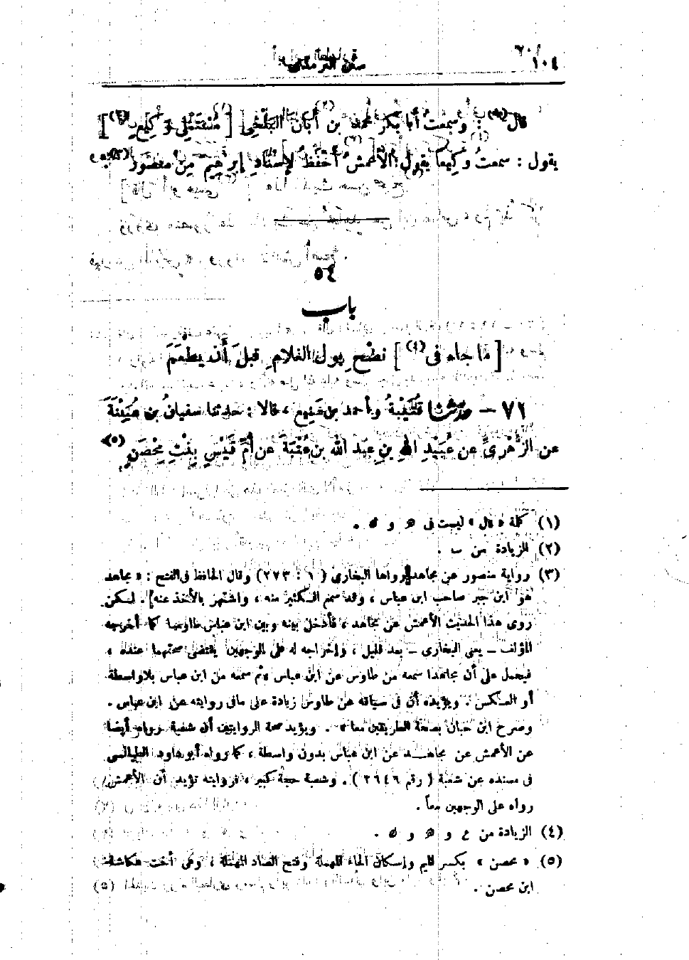 71 - حَدَّثَنَا قُتَيْبَةُ، وَأَحْمَدُ بْنُ مَنِيعٍ، قَالَا: حَدَّثَنَا سُفْيَانُ بْنُ عُيَيْنَةَ، عَنْ الزُّهْرِيِّ، عَنْ عُبَيْدِ اللَّهِ بْنِ عَبْدِ اللَّهِ بْنِ عُتْبَةَ، عَنْ أُمِّ قَيْسٍ بِنْتِ مِحْصَنٍ، -[105]- قَالَتْ: دَخَلْتُ بِابْنٍ لِي عَلَى النَّبِيِّ صَلَّى اللَّهُ عَلَيْهِ وَسَلَّمَ لَمْ يَأْكُلِ الطَّعَامَ §فَبَالَ عَلَيْهِ «فَدَعَا بِمَاءٍ فَرَشَّهُ عَلَيْهِ». وَفِي البَابِ عَنْ عَلِيٍّ، وَعَائِشَةَ، وَزَيْنَبَ، وَلُبَابَةَ بِنْتِ الحَارِثِ وَهِيَ أُمُّ الفَضْلِ بْنِ عَبَّاسِ بْنِ عَبْدِ المُطَّلِبِ، وَأَبِي السَّمْحِ، وَعَبْدِ اللَّهِ بْنِ عَمْرٍو، وَأَبِي لَيْلَى، وَابْنِ عَبَّاسٍ. " وَهُوَ قَوْلُ غَيْرِ وَاحِدٍ مِنْ أَصْحَابِ النَّبِيِّ صَلَّى اللَّهُ عَلَيْهِ وَسَلَّمَ، وَالتَّابِعِينَ، وَمَنْ بَعْدَهُمْ مِثْلِ أَحْمَدَ، وَإِسْحَاقَ، قَالُوا: يُنْضَحُ بَوْلُ الغُلَامِ، وَيُغْسَلُ بَوْلُ الجَارِيَةِ، وَهَذَا مَا لَمْ يَطْعَمَا، فَإِذَا طَعِمَا غُسِلَا جَمِيعًا "