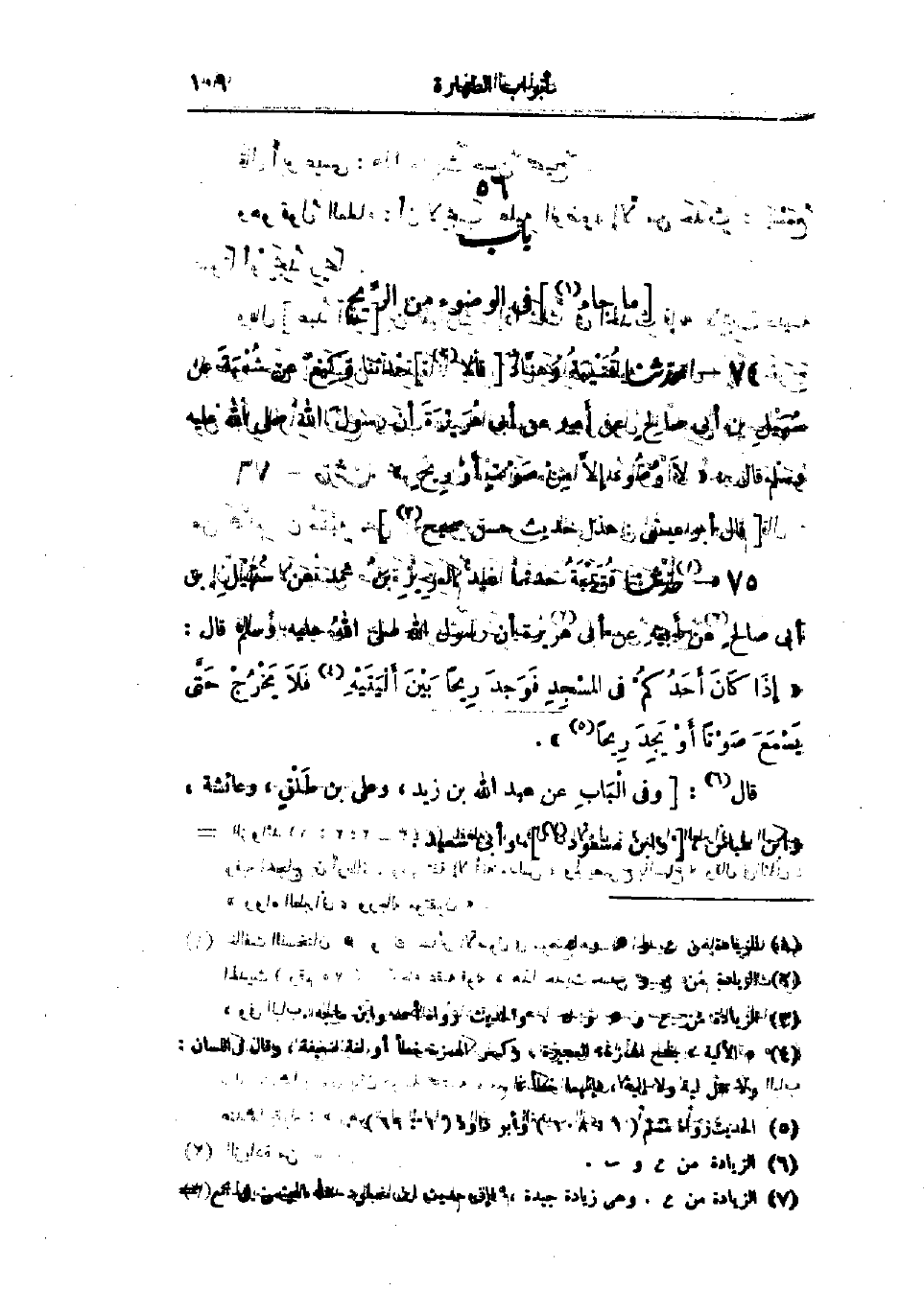 75 - حَدَّثَنَا قُتَيْبَةُ قَالَ: حَدَّثَنَا عَبْدُ العَزِيزِ بْنُ مُحَمَّدٍ، عَنْ سُهَيْلِ بْنِ أَبِي صَالِحٍ، عَنْ أَبِيهِ، عَنْ أَبِي هُرَيْرَةَ، أَنَّ رَسُولَ اللَّهِ صَلَّى اللَّهُ عَلَيْهِ وَسَلَّمَ قَالَ: «§إِذَا كَانَ أَحَدُكُمْ فِي المَسْجِدِ فَوَجَدَ رِيحًا بَيْنَ أَلْيَتَيْهِ فَلَا يَخْرُجْ حَتَّى يَسْمَعَ صَوْتًا، أَوْ يَجِدَ رِيحًا»، وَفِي البَابِ عَنْ عَبْدِ اللَّهِ بْنِ زَيْدٍ، وَعَلِيِّ بْنِ طَلْقٍ، وَعَائِشَةَ، وَابْنِ عَبَّاسٍ، وَأَبِي سَعِيدٍ،: -[110]- هَذَا حَدِيثٌ حَسَنٌ صَحِيحٌ " وَهُوَ قَوْلُ العُلَمَاءِ: أَنْ لَا يَجِبَ عَلَيْهِ الوُضُوءُ إِلَّا مِنْ حَدَثٍ يَسْمَعُ صَوْتًا أَوْ يَجِدُ رِيحًا " وقَالَ ابْنُ المُبَارَكِ: «إِذَا شَكَّ فِي الحَدَثِ، فَإِنَّهُ لَا يَجِبُ عَلَيْهِ الوُضُوءُ، حَتَّى يَسْتَيْقِنَ اسْتِيقَانًا يَقْدِرُ أَنْ يَحْلِفَ عَلَيْهِ»، وَقَالَ: «إِذَا خَرَجَ مِنْ قُبُلِ المَرْأَةِ الرِّيحُ وَجَبَ عَلَيْهَا الوُضُوءُ» وَهُوَ قَوْلُ الشَّافِعِيِّ، وَإِسْحَاقَ