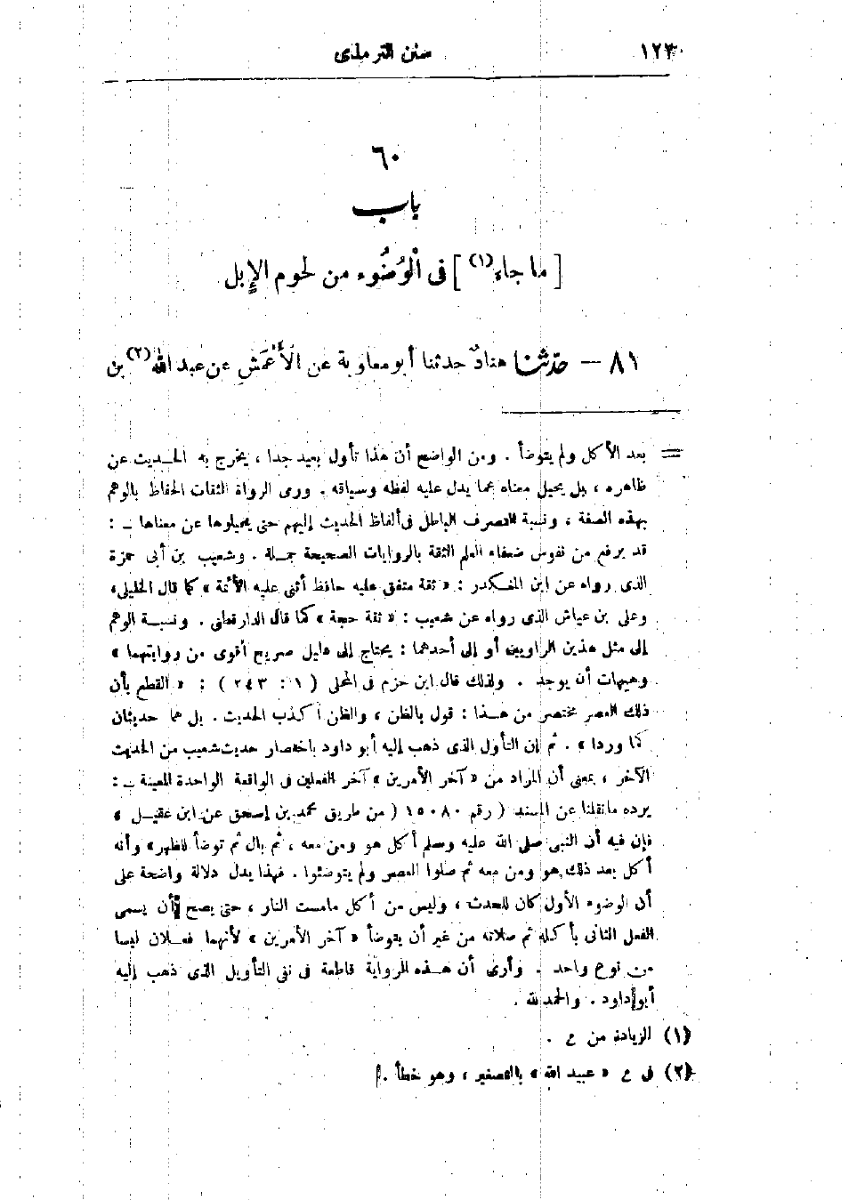 81 - حَدَّثَنَا هَنَّادٌ قَالَ: حَدَّثَنَا أَبُو مُعَاوِيَةَ، عَنْ الأَعْمَشِ، عَنْ عَبْدِ اللَّهِ بْنِ -[123]- عَبْدِ اللَّهِ، عَنْ عَبْدِ الرَّحْمَنِ بْنِ أَبِي لَيْلَى، عَنْ البَرَاءِ بْنِ عَازِبٍ، قَالَ: سُئِلَ رَسُولُ اللَّهِ صَلَّى اللَّهُ عَلَيْهِ وَسَلَّمَ عَنِ الوُضُوءِ مِنْ لُحُومِ الإِبِلِ؟ فَقَالَ: «§تَوَضَّئُوا مِنْهَا»، وَسُئِلَ عَنِ الوُضُوءِ مِنْ لُحُومِ الغَنَمِ؟ فَقَالَ: «لَا تَتَوَضَّئُوا مِنْهَا»، وَفِي البَابِ عَنْ جَابِرِ بْنِ سَمُرَةَ، وَأُسَيْدِ بْنِ حُضَيْرٍ،: وَقَدْ رَوَى الحَجَّاجُ بْنُ أَرْطَاةَ هَذَا الحَدِيثَ، عَنْ عَبْدِ اللَّهِ بْنِ عَبْدِ اللَّهِ، عَنْ عَبْدِ الرَّحْمَنِ بْنِ أَبِي لَيْلَى، عَنْ أُسَيْدِ بْنِ حُضَيْرٍ، وَالصَّحِيحُ حَدِيثُ عَبْدِ الرَّحْمَنِ بْنِ أَبِي لَيْلَى، عَنِ البَرَاءِ بْنِ عَازِبٍ، وَهُوَ قَوْلُ أَحْمَدَ، وَإِسْحَاقَ، -[124]- وَرَوَى عُبَيْدَةُ الضَّبِّيُّ، عَنْ عَبْدِ اللَّهِ بْنِ عَبْدِ اللَّهِ الرَّازِيِّ، عَنْ عَبْدِ الرَّحْمَنِ بْنِ أَبِي لَيْلَى، عَنْ ذِي الغُرَّةِ، وَرَوَى حَمَّادُ بْنُ سَلَمَةَ هَذَا الحَدِيثَ، عَنِ الحَجَّاجِ بْنِ أَرْطَاةَ، فَأَخْطَأَ فِيهِ، وَقَالَ فِيهِ: عَنْ عَبْدِ اللَّهِ بْنِ عَبْدِ الرَّحْمَنِ بْنِ أَبِي لَيْلَى، عَنْ أَبِيهِ، عَنْ أُسَيْدِ بْنِ حُضَيْرٍ، وَالصَّحِيحُ عَنْ عَبْدِ اللَّهِ بْنِ عَبْدِ اللَّهِ الرَّازِيِّ، عَنْ عَبْدِ الرَّحْمَنِ بْنِ أَبِي لَيْلَى، عَنِ البَرَاءِ، -[125]- قَالَ إِسْحَاقُ: أَصَحُّ مَا فِي هَذَا البَابِ حَدِيثَانِ عَنْ رَسُولِ اللَّهِ صَلَّى اللَّهُ عَلَيْهِ وَسَلَّمَ حَدِيثُ البَرَاءِ، وَحَدِيثُ جَابِرِ بْنِ سَمُرَةَ
