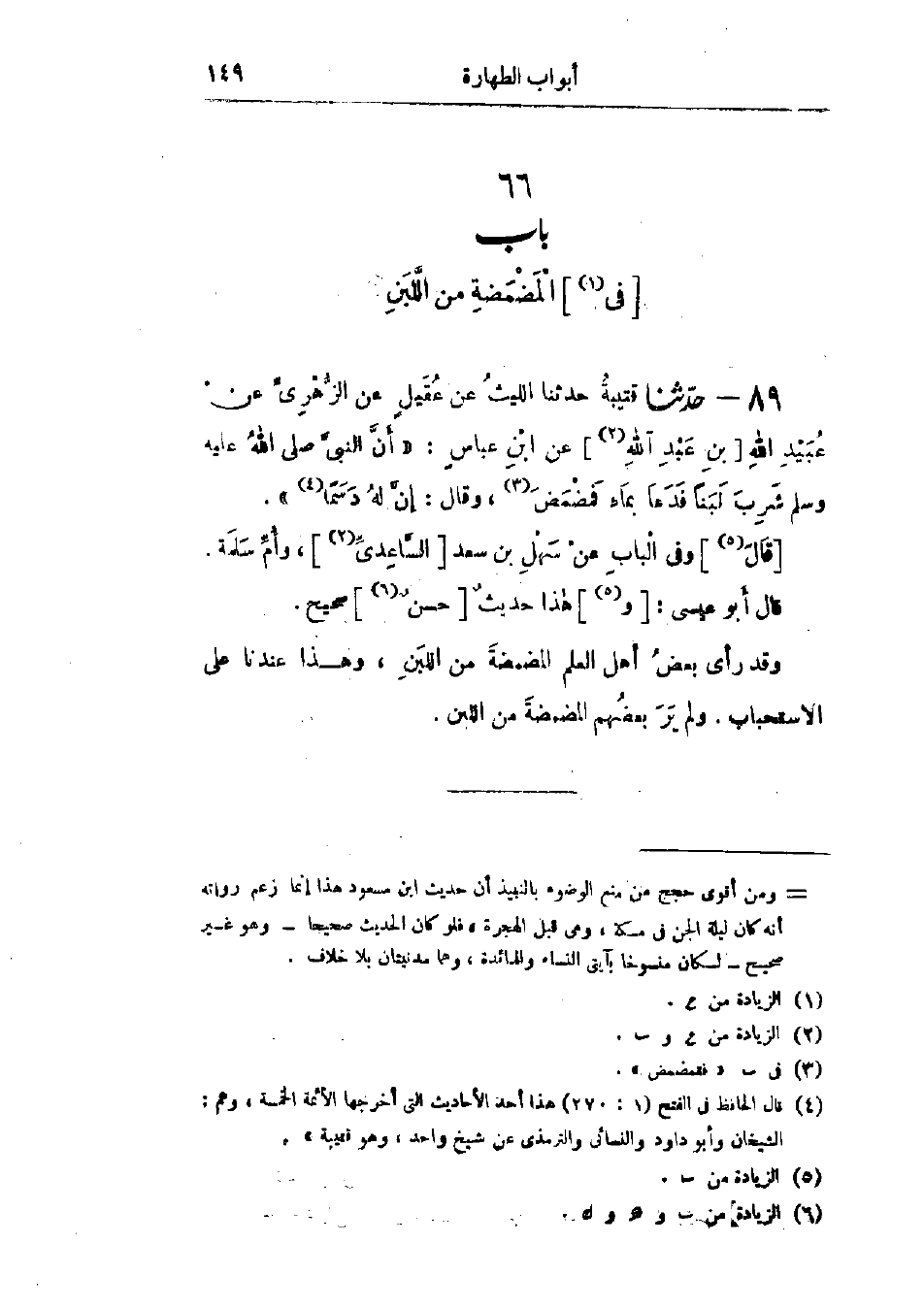 89 - حَدَّثَنَا قُتَيْبَةُ قَالَ: حَدَّثَنَا اللَّيْثُ، عَنْ عُقَيْلٍ، عَنْ الزُّهْرِيِّ، عَنْ عُبَيْدِ اللَّهِ، عَنْ ابْنِ عَبَّاسٍ، أَنَّ النَّبِيَّ صَلَّى اللَّهُ عَلَيْهِ وَسَلَّمَ §شَرِبَ لَبَنًا فَدَعَا بِمَاءٍ فَمَضْمَضَ، وَقَالَ: «إِنَّ لَهُ دَسَمًا»، وَفِي البَابِ عَنْ سَهْلِ بْنِ سَعْدٍ، وَأُمِّ سَلَمَةَ،: وَهَذَا حَدِيثٌ حَسَنٌ صَحِيحٌ وَقَدْ رَأَى بَعْضُ أَهْلِ العِلْمِ المَضْمَضَةَ مِنَ اللَّبَنِ، وَهَذَا عِنْدَنَا عَلَى الِاسْتِحْبَابِ، وَلَمْ يَرَ بَعْضُهُمُ المَضْمَضَةَ مِنَ اللَّبَنِ