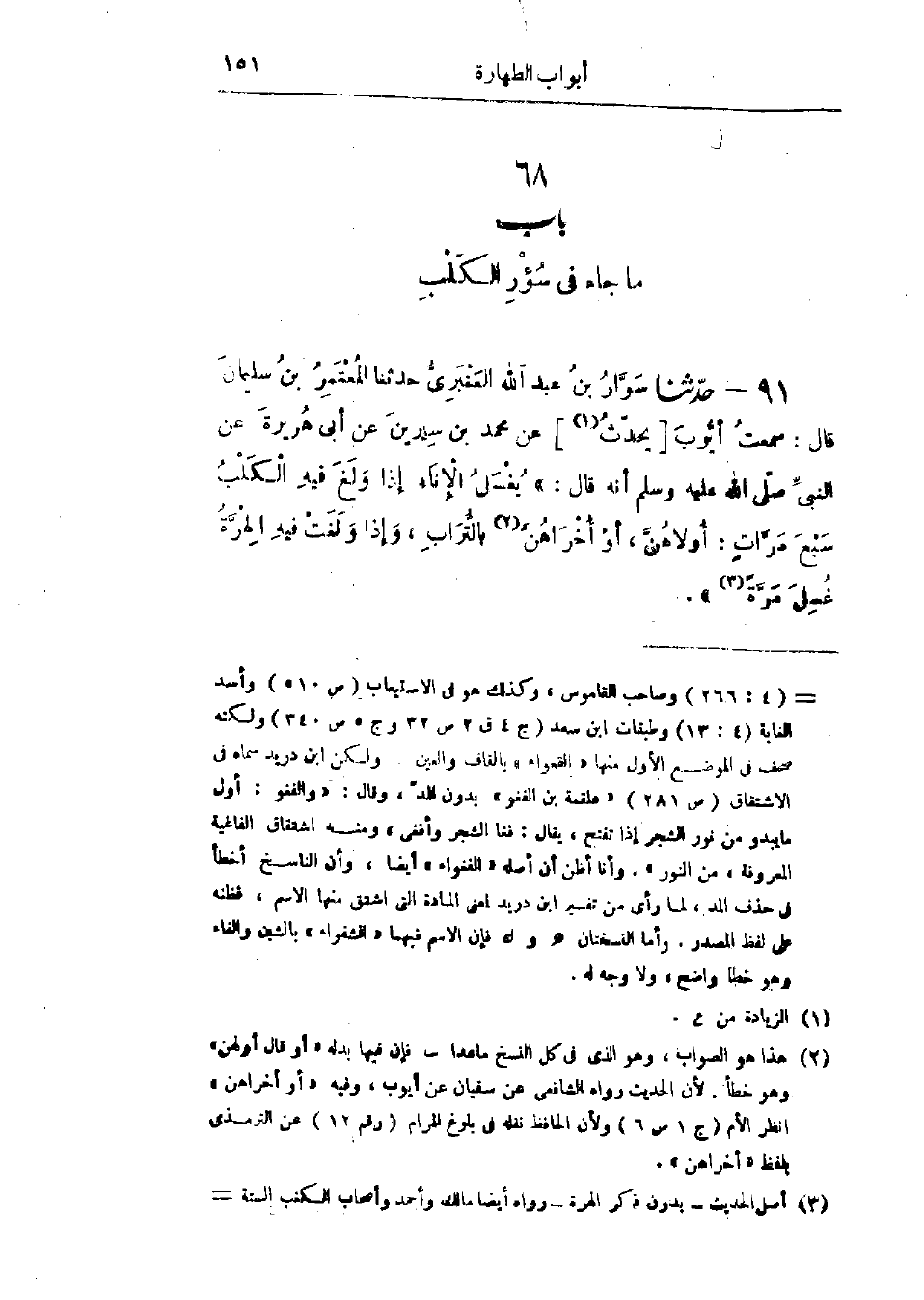 91 - حَدَّثَنَا سَوَّارُ بْنُ عَبْدِ اللَّهِ العَنْبَرِيُّ قَالَ: حَدَّثَنَا المُعْتَمِرُ بْنُ سُلَيْمَانَ، قَال: سَمِعْتُ أَيُّوبَ، عَنْ مُحَمَّدِ بْنِ سِيرِينَ، عَنْ أَبِي هُرَيْرَةَ، عَنِ النَّبِيِّ صَلَّى اللَّهُ عَلَيْهِ وَسَلَّمَ أَنَّهُ قَالَ: " §يُغْسَلُ الإِنَاءُ إِذَا وَلَغَ فِيهِ الكَلْبُ سَبْعَ مَرَّاتٍ: أُولَاهُنَّ أَوْ أُخْرَاهُنَّ بِالتُّرَابِ، وَإِذَا وَلَغَتْ فِيهِ الهِرَّةُ غُسِلَ مَرَّةً "، -[152]- هَذَا حَدِيثٌ حَسَنٌ صَحِيحٌ، وَهُوَ قَوْلُ الشَّافِعِيِّ، وَأَحْمَدَ، وَإِسْحَاقَ، وَقَدْ رُوِيَ هَذَا الحَدِيثُ مِنْ غَيْرِ وَجْهٍ عَنْ أَبِي هُرَيْرَةَ، عَنِ النَّبِيِّ صَلَّى اللَّهُ عَلَيْهِ وَسَلَّمَ نَحْوَ هَذَا، وَلَمْ يُذْكَرْ فِيهِ: «إِذَا وَلَغَتْ فِيهِ الهِرَّةُ غُسِلَ مَرَّةً»، وَفِي البَابِ عَنْ عَبْدِ اللَّهِ بْنِ مُغَفَّلٍ