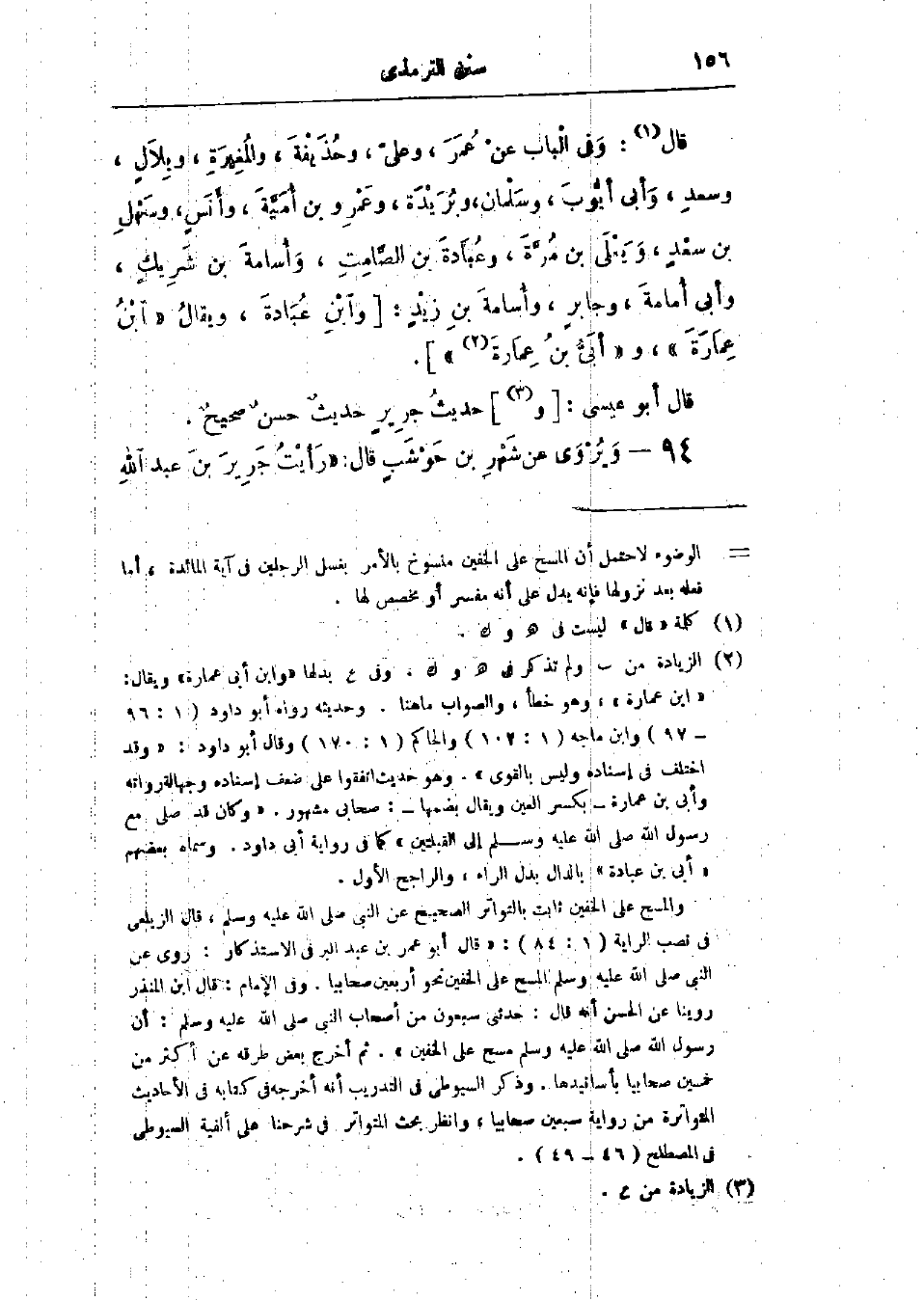 94 - وَيُرْوَى عَنْ شَهْرِ بْنِ حَوْشَبٍ، قَالَ: رَأَيْتُ جَرِيرَ بْنَ عَبْدِ اللَّهِ -[157]- §تَوَضَّأَ، وَمَسَحَ عَلَى خُفَّيْهِ، فَقُلْتُ لَهُ فِي ذَلِكَ، فَقَالَ: «رَأَيْتُ النَّبِيَّ صَلَّى اللَّهُ عَلَيْهِ وَسَلَّمَ تَوَضَّأَ، وَمَسَحَ عَلَى خُفَّيْهِ»، فَقُلْتُ لَهُ: أَقَبْلَ المَائِدَةِ، أَمْ بَعْدَ المَائِدَةِ؟ فَقَالَ: مَا أَسْلَمْتُ إِلَّا بَعْدَ المَائِدَةِ، حَدَّثَنَا بِذَلِكَ قُتَيْبَةُ قَالَ: حَدَّثَنَا خَالِدُ بْنُ زِيَادٍ التِّرْمِذِيُّ، عَنْ مُقَاتِلِ بْنِ حَيَّانَ، عَنْ شَهْرِ بْنِ حَوْشَبٍ، عَنْ جَرِيرٍ، وَرَوَى بَقِيَّةُ، عَنْ إِبْرَاهِيمَ بْنِ أَدْهَمَ، عَنْ مُقَاتِلِ بْنِ حَيَّانَ، عَنْ شَهْرِ بْنِ حَوْشَبٍ، عَنْ جَرِيرٍ «وَهَذَا حَدِيثٌ مُفَسَّرٌ لِأَنَّ بَعْضَ مَنْ أَنْكَرَ المَسْحَ عَلَى الخُفَّيْنِ تَأَوَّلَ أَنَّ مَسْحَ النَّبِيِّ صَلَّى اللَّهُ عَلَيْهِ وَسَلَّمَ عَلَى الخُفَّيْنِ كَانَ قَبْلَ نُزُولِ المَائِدَةِ، وَذَكَرَ -[158]- جَرِيرٌ فِي حَدِيثِهِ أَنَّهُ رَأَى النَّبِيَّ صَلَّى اللَّهُ عَلَيْهِ وَسَلَّمَ مَسَحَ عَلَى الخُفَّيْنِ بَعْدَ نُزُولِ المَائِدَةِ»