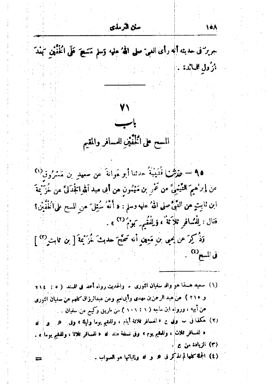 95 - حَدَّثَنَا قُتَيْبَةُ قَالَ: حَدَّثَنَا أَبُو عَوَانَةَ، عَنْ سَعِيدِ بْنِ مَسْرُوقٍ، عَنْ إِبْرَاهِيمَ التَّيْمِيِّ، عَنْ عَمْرِو بْنِ مَيْمُونٍ، عَنْ أَبِي عَبْدِ اللَّهِ الجَدَلِيِّ، عَنْ خُزَيْمَةَ بْنِ ثَابِتٍ، عَنِ النَّبِيِّ صَلَّى اللَّهُ عَلَيْهِ وَسَلَّمَ، أَنَّهُ سُئِلَ عَنِ المَسْحِ عَلَى الخُفَّيْنِ؟ فَقَالَ: «§لِلْمُسَافِرِ ثَلَاثَةٌ، وَلِلْمُقِيمِ يَوْمٌ»، وَذُكِرَ عَنْ يَحْيَى بْنِ مَعِينٍ أَنَّهُ صَحَّحَ حَدِيثَ خُزَيْمَةَ بْنِ ثَابِتٍ فِي المَسْحِ، -[159]- وَأَبُو عَبْدِ اللَّهِ الجَدَلِيُّ اسْمُهُ عَبْدُ بْنُ عَبْدٍ، وَيُقَالُ: عَبْدُ الرَّحْمَنِ بْنُ عَبْدٍ: هَذَا حَدِيثٌ حَسَنٌ صَحِيحٌ وَفِي البَابِ عَنْ عَلِيٍّ، وَأَبِي بَكْرَةَ، وَأَبِي هُرَيْرَةَ، وَصَفْوَانَ بْنِ عَسَّالٍ، وَعَوْفِ بْنِ مَالِكٍ، وَابْنِ عُمَرَ، وَجَرِيرٍ
