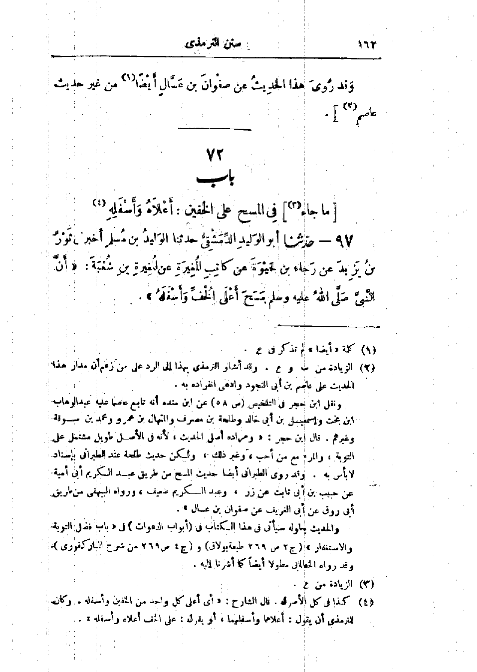 97 - حَدَّثَنَا أَبُو الوَلِيدِ الدِّمَشْقِيُّ قَالَ: حَدَّثَنَا الوَلِيدُ بْنُ مُسْلِمٍ قَالَ: أَخْبَرَنِي ثَوْرُ بْنُ يَزِيدَ، عَنْ رَجَاءِ بْنِ حَيْوَةَ، عَنْ كَاتِبِ المُغِيرَةِ، عَنْ المُغِيرَةِ بْنِ شُعْبَةَ، «أَنَّ النَّبِيَّ صَلَّى اللَّهُ عَلَيْهِ وَسَلَّمَ §مَسَحَ أَعْلَى الخُفِّ وَأَسْفَلَهُ»،: " -[163]- وَهَذَا قَوْلُ غَيْرِ وَاحِدٍ مِنْ أَصْحَابِ النَّبِيِّ صَلَّى اللَّهُ عَلَيْهِ وَسَلَّمَ، وَالتَّابِعِينَ، وَبِهِ يَقُولُ مَالِكٌ، وَالشَّافِعِيُّ، وَإِسْحَاقُ، وَهَذَا حَدِيثٌ مَعْلُولٌ، لَمْ يُسْنِدْهُ عَنْ ثَوْرِ بْنِ يَزِيدَ غَيْرُ الوَلِيدِ بْنِ مُسْلِمٍ، وَسَأَلْتُ أَبَا زُرْعَةَ، وَمُحَمَّدًا عَنْ هَذَا الحَدِيثِ، فَقَالَا: " لَيْسَ بِصَحِيحٍ، لِأَنَّ ابْنَ المُبَارَكِ رَوَى هَذَا عَنْ ثَوْرٍ، عَنْ رَجَاءٍ، قَالَ: حُدِّثْتُ عَنْ كَاتِبِ المُغِيرَةِ، مُرْسَلٌ عَنِ النَّبِيِّ صَلَّى اللَّهُ عَلَيْهِ وَسَلَّمَ، وَلَمْ يُذْكَرْ فِيهِ المُغِيرَةُ "