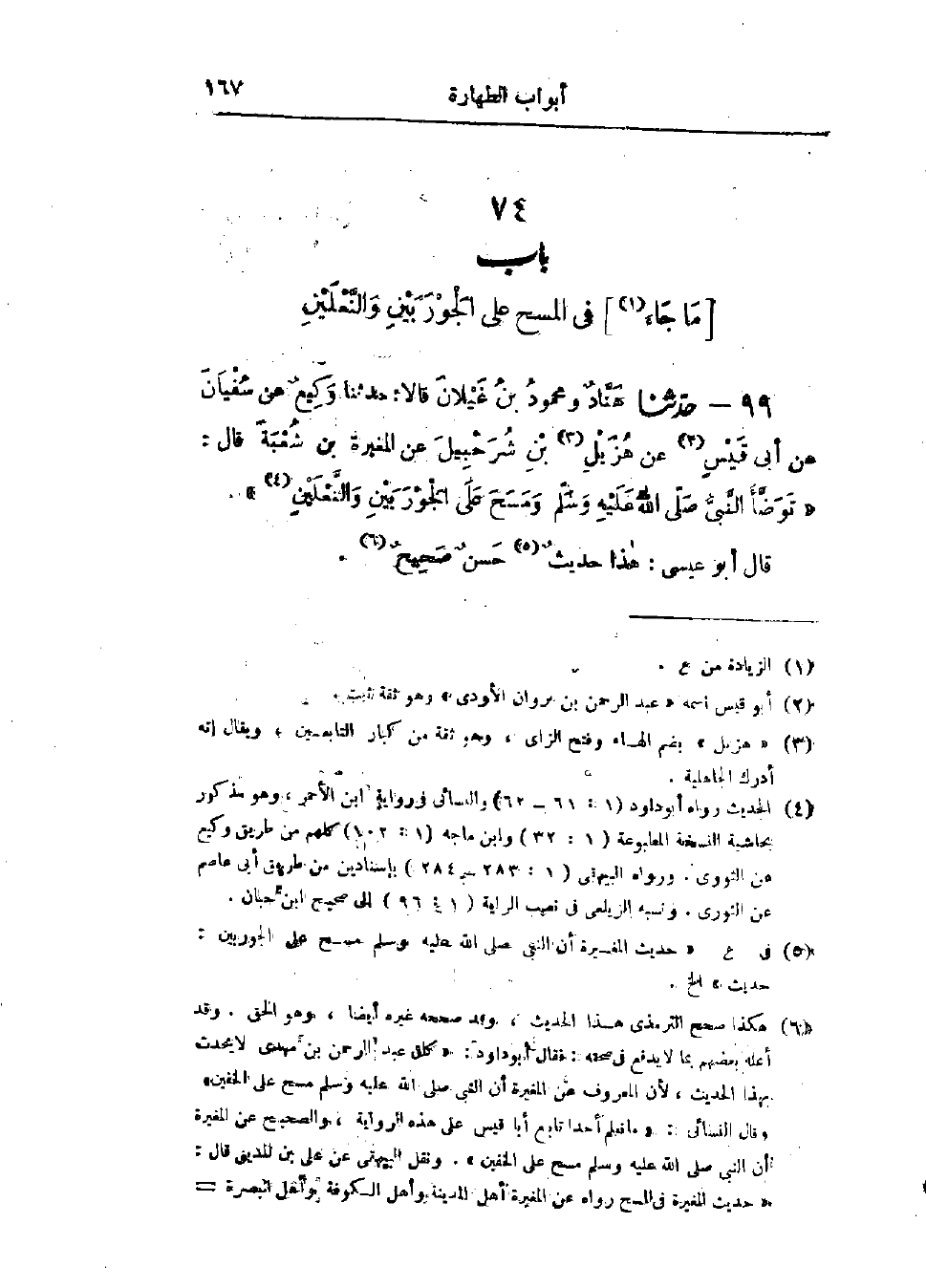 99 - حَدَّثَنَا هَنَّادٌ، وَمَحْمُودُ بْنُ غَيْلَانَ، قَالَا: حَدَّثَنَا وَكِيعٌ، عَنْ سُفْيَانَ، عَنْ أَبِي قَيْسٍ، عَنْ هُزَيْلِ بْنِ شُرَحْبِيلَ، عَنْ المُغِيرَةِ بْنِ شُعْبَةَ، قَالَ: «§تَوَضَّأَ النَّبِيُّ صَلَّى اللَّهُ عَلَيْهِ وَسَلَّمَ وَمَسَحَ عَلَى الجَوْرَبَيْنِ وَالنَّعْلَيْنِ»، هَذَا حَدِيثٌ حَسَنٌ صَحِيحٌ، -[168]- وَهُوَ قَوْلُ غَيْرِ وَاحِدٍ مِنْ أَهْلِ العِلْمِ، وَبِهِ يَقُولُ سُفْيَانُ الثَّوْرِيُّ، وَابْنُ المُبَارَكِ، وَالشَّافِعِيُّ، وَأَحْمَدُ، وَإِسْحَاقُ، قَالُوا: يَمْسَحُ عَلَى الجَوْرَبَيْنِ وَإِنْ لَمْ تَكُنْ نَعْلَيْنِ إِذَا كَانَا ثَخِينَيْنِ "، -[169]- وَفِي البَابِ عَنْ أَبِي مُوسَى
