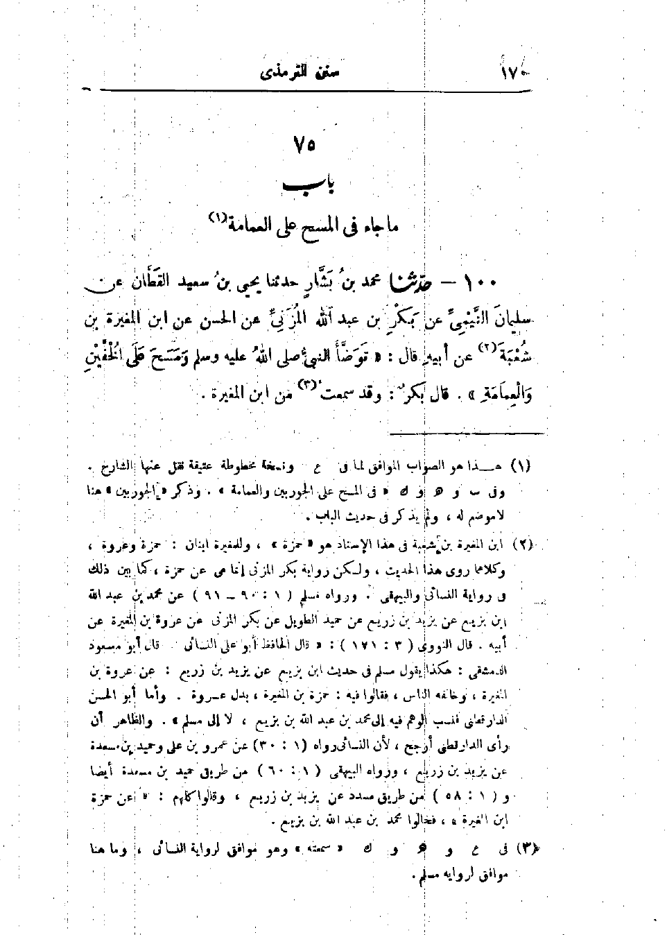100 - حَدَّثَنَا مُحَمَّدُ بْنُ بَشَّارٍ قَالَ: حَدَّثَنَا يَحْيَى بْنُ سَعِيدٍ القَطَّانُ، عَنْ سُلَيْمَانَ التَّيْمِيِّ، عَنْ بَكْرِ بْنِ عَبْدِ اللَّهِ المُزَنِيِّ، عَنْ الحَسَنِ، عَنْ ابْنِ المُغِيرَةِ بْنِ شُعْبَةَ، عَنْ أَبِيهِ، قَالَ: «§تَوَضَّأَ النَّبِيُّ صَلَّى اللَّهُ عَلَيْهِ وَسَلَّمَ وَمَسَحَ عَلَى الخُفَّيْنِ وَالعِمَامَةِ»، قَالَ بَكْرٌ: وَقَدْ سَمِعْتُهُ مِنَ ابْنِ المُغِيرَةِ، -[171]- وَذَكَرَ مُحَمَّدُ بْنُ بَشَّارٍ فِي هَذَا الحَدِيثِ فِي مَوْضِعٍ آخَرَ «أَنَّهُ مَسَحَ عَلَى نَاصِيَتِهِ وَعِمَامَتِهِ» وَقَدْ رُوِيَ هَذَا الحَدِيثُ مِنْ غَيْرِ وَجْهٍ عَنِ المُغِيرَةِ بْنِ شُعْبَةَ، وَذَكَرَ بَعْضُهُمْ «المَسْحَ عَلَى النَّاصِيَةِ وَالعِمَامَةِ»، وَلَمْ يَذْكُرْ بَعْضُهُمْ النَّاصِيَةَ، وسَمِعْت أَحْمَدَ بْنَ الحَسَنِ يَقُولُ: سَمِعْتُ أَحْمَدَ بْنَ حَنْبَلٍ يَقُولُ: «مَا رَأَيْتُ بِعَيْنِي مِثْلَ يَحْيَى بْنِ سَعِيدٍ القَطَّانِ» وَفِي البَابِ عَنْ عَمْرِو بْنِ أُمَيَّةِ، وَسَلْمَانَ، وَثَوْبَانَ، وَأَبِي أُمَامَةَ، حَدِيثُ المُغِيرَةِ بْنِ شُعْبَةَ حَدِيثٌ حَسَنٌ صَحِيحٌ، وَهُوَ قَوْلُ غَيْرِ وَاحِدٍ مِنْ أَهْلِ العِلْمِ مِنْ أَصْحَابِ النَّبِيِّ صَلَّى اللَّهُ عَلَيْهِ وَسَلَّمَ مِنْهُمْ: أَبُو بَكْرٍ، وَعُمَرُ، وَأَنَسٌ، وَبِهِ يَقُولُ الأَوْزَاعِيُّ، وَأَحْمَدُ، وَإِسْحَاقُ قَالُوا: يَمْسَحُ عَلَى العِمَامَةِ، وقَالَ غَيْرُ وَاحِدٍ مِنْ أَهْلِ العِلْمِ مِنْ أَصْحَابِ النَّبِيِّ صَلَّى اللَّهُ عَلَيْهِ وَسَلَّمَ، وَالتَّابِعِينَ: لَا يَمْسَحُ عَلَى العِمَامَةِ إِلَّا أَنْ يَمْسَحَ بِرَأْسِهِ مَعَ العِمَامَةِ، وَهُوَ قَوْلُ سُفْيَانَ الثَّوْرِيِّ، وَمَالِكِ بْنِ أَنَسٍ، وَابْنِ المُبَارَكِ، وَالشَّافِعِيِّ، وسَمِعْت الجَارُودَ بْنَ مُعَاذٍ يَقُولُ: سَمِعْتُ وَكِيعَ بْنَ الجَرَّاحِ يَقُولُ: إِنْ مَسَحَ عَلَى العِمَامَةِ يُجْزِئُهُ لِلأَثَرِ