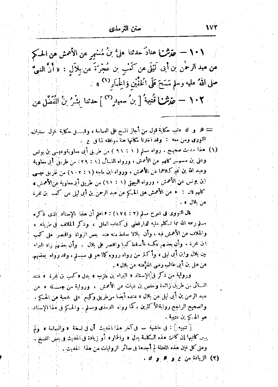 101 - حَدَّثَنَا هَنَّادٌ قَالَ: حَدَّثَنَا عَلِيُّ بْنُ مُسْهِرٍ، عَنْ الأَعْمَشِ، عَنْ الحَكَمِ، عَنْ عَبْدِ الرَّحْمَنِ بْنِ أَبِي لَيْلَى، عَنْ كَعْبِ بْنِ عُجْرَةَ، عَنْ بِلَالٍ، «أَنَّ النَّبِيَّ صَلَّى اللَّهُ عَلَيْهِ وَسَلَّمَ §مَسَحَ عَلَى الخُفَّيْنِ وَالخِمَارِ»
