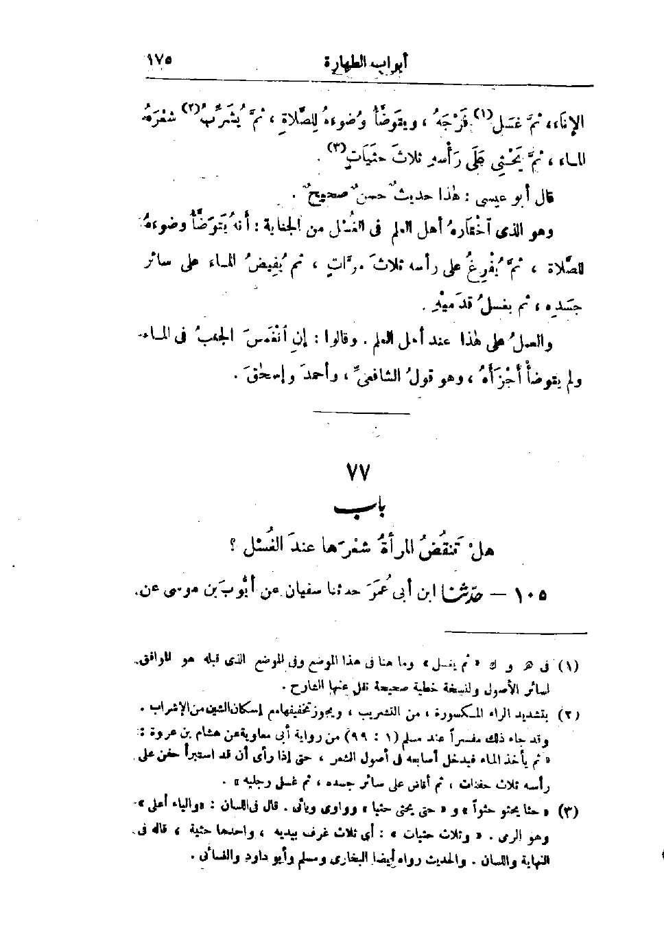 105 - حَدَّثَنَا ابْنُ أَبِي عُمَرَ قَالَ: حَدَّثَنَا سُفْيَانُ، عَنْ أَيُّوبَ بْنِ مُوسَى، عَنْ -[176]- سَعِيدٍ المَقْبُرِيِّ، عَنْ عَبْدِ اللَّهِ بْنِ رَافِعٍ، عَنْ أُمِّ سَلَمَةَ، قَالَتْ: قُلْتُ: يَا رَسُولَ اللَّهِ، إِنِّي امْرَأَةٌ أَشُدُّ ضَفْرَ رَأْسِي، أَفَأَنْقُضُهُ لِغُسْلِ الجَنَابَةِ؟ قَالَ: «لَا §إِنَّمَا يَكْفِيكِ أَنْ تَحْثِي عَلَى رَأْسِكِ ثَلَاثَ حَثَيَاتٍ مِنْ مَاءٍ، ثُمَّ -[177]- تُفِيضِي عَلَى سَائِرِ جَسَدِكِ المَاءَ، فَتَطْهُرِينَ»، أَوْ قَالَ: «فَإِذَا أَنْتِ قَدْ تَطَهَّرْتِ»، هَذَا حَدِيثٌ حَسَنٌ صَحِيحٌ " وَالعَمَلُ عَلَى هَذَا عِنْدَ أَهْلِ العِلْمِ: أَنَّ المَرْأَةَ إِذَا اغْتَسَلَتْ مِنَ الجَنَابَةِ فَلَمْ تَنْقُضْ شَعْرَهَا أَنَّ ذَلِكَ يُجْزِئُهَا بَعْدَ أَنْ تُفِيضَ المَاءَ عَلَى رَأْسِهَا "