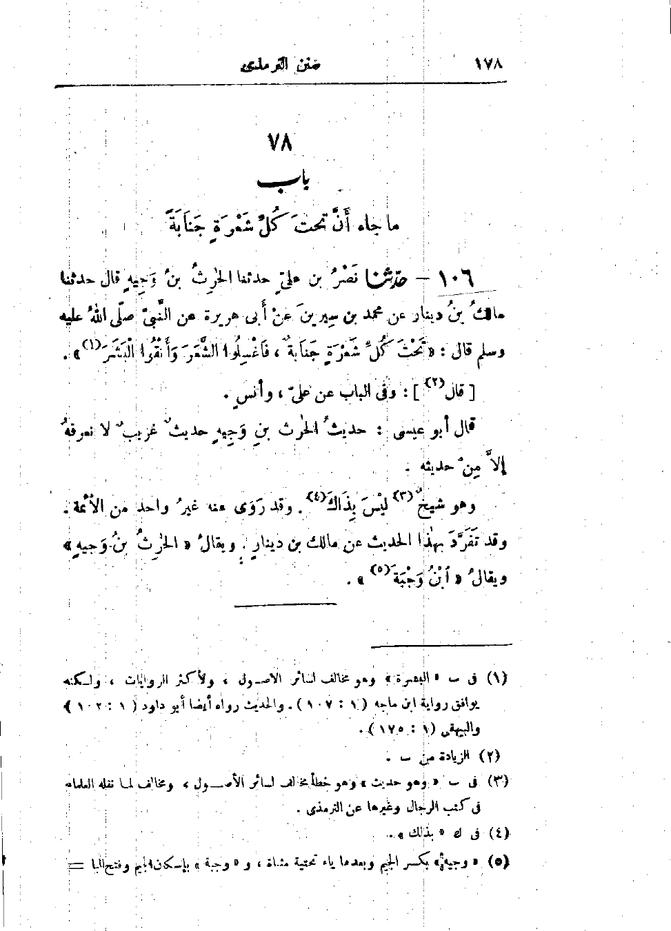 106 - حَدَّثَنَا نَصْرُ بْنُ عَلِيٍّ قَالَ: حَدَّثَنَا الحَارِثُ بْنُ وَجِيهٍ، قَالَ: حَدَّثَنَا مَالِكُ بْنُ دِينَارٍ، عَنْ مُحَمَّدِ بْنِ سِيرِينَ، عَنْ أَبِي هُرَيْرَةَ، عَنِ النَّبِيِّ صَلَّى اللَّهُ عَلَيْهِ وَسَلَّمَ قَالَ: «§تَحْتَ كُلِّ شَعْرَةٍ جَنَابَةٌ، فَاغْسِلُوا الشَّعْرَ، وَأَنْقُوا البَشَرَ»، وَفِي البَابِ عَنْ عَلِيٍّ، وَأَنَسٍ، حَدِيثُ الحَارِثِ بْنِ وَجِيهٍ حَدِيثٌ غَرِيبٌ، لَا نَعْرِفُهُ إِلَّا مِنْ حَدِيثِهِ، وَهُوَ شَيْخٌ لَيْسَ بِذَاكَ، وَقَدْ رَوَى عَنْهُ غَيْرُ وَاحِدٍ مِنَ الأَئِمَّةِ، وَقَدْ تَفَرَّدَ بِهَذَا الحَدِيثِ، عَنْ مَالِكِ بْنِ دِينَارٍ، وَيُقَالُ: الحَارِثُ بْنُ وَجِيهٍ، وَيُقَالُ: ابْنُ وَجْبَةَ "
