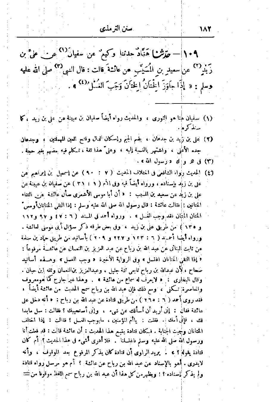 109 - حَدَّثَنَا هَنَّادٌ قَالَ: حَدَّثَنَا وَكِيعٌ، عَنْ سُفْيَانَ، عَنْ عَلِيِّ بْنِ زَيْدٍ، عَنْ سَعِيدِ بْنِ المُسَيِّبِ، عَنْ عَائِشَةَ، قَالَتْ: قَالَ النَّبِيُّ صَلَّى اللَّهُ عَلَيْهِ وَسَلَّمَ: «§إِذَا جَاوَزَ الخِتَانُ الخِتَانَ وَجَبَ الغُسْلُ»،: -[183]- حَدِيثُ عَائِشَةَ حَدِيثٌ حَسَنٌ صَحِيحٌ، وَقَدْ رُوِيَ هَذَا الحَدِيثُ عَنْ عَائِشَةَ عَنِ النَّبِيِّ صَلَّى اللَّهُ عَلَيْهِ وَسَلَّمَ مِنْ غَيْرِ وَجْهٍ: «إِذَا جَاوَزَ الخِتَانُ الخِتَانَ وَجَبَ الغُسْلُ»، وَهُوَ قَوْلُ أَكْثَرِ أَهْلِ العِلْمِ مِنْ أَصْحَابِ النَّبِيِّ صَلَّى اللَّهُ عَلَيْهِ وَسَلَّمَ مِنْهُمْ: أَبُو بَكْرٍ، وَعُمَرُ، وَعُثْمَانُ، وَعَلِيٌّ، وَعَائِشَةُ، وَالفُقَهَاءِ مِنَ التَّابِعِينَ، وَمَنْ بَعْدَهُمْ مِثْلِ سُفْيَانَ الثَّوْرِيِّ، وَالشَّافِعِيِّ، وَأَحْمَدَ، وَإِسْحَاقَ، قَالُوا: إِذَا التَقَى الخِتَانَانِ وَجَبَ الغُسْلُ