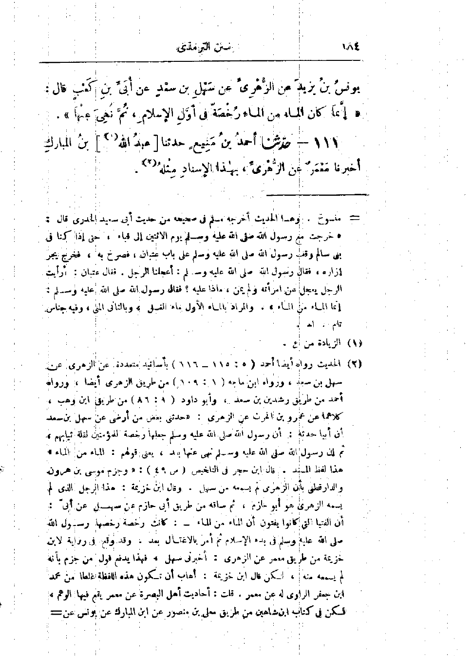 111 - حَدَّثَنَا أَحْمَدُ بْنُ مَنِيعٍ قَالَ: حَدَّثَنَا ابْنُ المُبَارَكِ قَالَ: أَخْبَرَنَا مَعْمَرٌ، عَنِ الزُّهْرِيِّ بِهَذَا الإِسْنَادِ مِثْلَهُ، -[185]- هَذَا حَدِيثٌ حَسَنٌ صَحِيحٌ، وَإِنَّمَا كَانَ المَاءُ مِنَ المَاءِ فِي أَوَّلِ الإِسْلَامِ، ثُمَّ نُسِخَ بَعْدَ ذَلِكَ، وَهَكَذَا رَوَى غَيْرُ وَاحِدٍ مِنْ أَصْحَابِ النَّبِيِّ صَلَّى اللَّهُ عَلَيْهِ وَسَلَّمَ مِنْهُمْ: أُبَيُّ بْنُ كَعْبٍ، وَرَافِعُ بْنُ خَدِيجٍ، وَالعَمَلُ عَلَى هَذَا عِنْدَ أَكْثَرِ أَهْلِ العِلْمِ: عَلَى أَنَّهُ إِذَا جَامَعَ الرَّجُلُ امْرَأَتَهُ فِي الفَرْجِ وَجَبَ عَلَيْهِمَا الغُسْلُ وَإِنْ لَمْ يُنْزِلَا