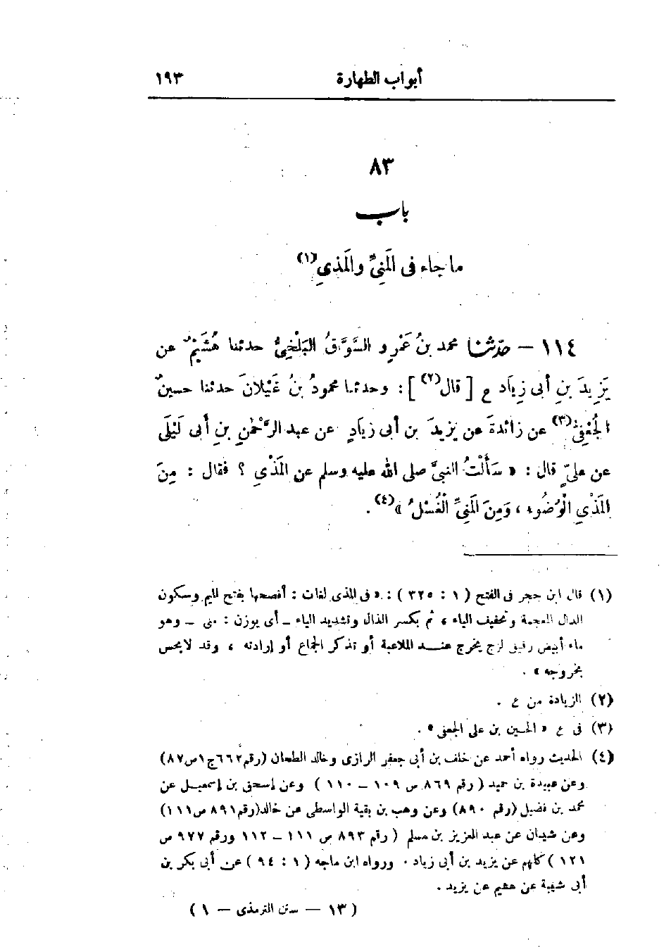 114 - حَدَّثَنَا مُحَمَّدُ بْنُ عَمْرٍو السَّوَّاقُ البَلْخِيُّ قَالَ: حَدَّثَنَا هُشَيْمٌ، عَنْ يَزِيدَ بْنِ أَبِي زِيَادٍ، ح وحَدَّثَنَا مَحْمُودُ بْنُ غَيْلَانَ قَالَ: حَدَّثَنَا حُسَيْنٌ الجُعْفِيُّ، عَنْ زَائِدَةَ، عَنْ يَزِيدَ بْنِ أَبِي زِيَادٍ، عَنْ عَبْدِ الرَّحْمَنِ بْنِ أَبِي لَيْلَى، عَنْ عَلِيٍّ، قَالَ: سَأَلْتُ النَّبِيَّ صَلَّى اللَّهُ عَلَيْهِ وَسَلَّمَ عَنِ المَذْيِ، فَقَالَ: «§مِنَ المَذْيِ الوُضُوءُ، وَمِنَ المَنِيِّ الغُسْلُ»، -[194]- وَفِي البَابِ عَنْ المِقْدَادِ بْنِ الأَسْوَدِ، وَأُبَيِّ بْنِ كَعْبٍ، هَذَا حَدِيثٌ حَسَنٌ صَحِيحٌ -[195]- وَقَدْ رُوِيَ عَنْ عَلِيِّ بْنِ أَبِي طَالِبٍ، عَنِ النَّبِيِّ صَلَّى اللَّهُ عَلَيْهِ وَسَلَّمَ مِنْ غَيْرِ -[196]- وَجْهٍ: «مِنَ المَذْيِ الوُضُوءُ، وَمِنَ المَنِيِّ الغُسْلُ»، -[197]- وَهُوَ قَوْلُ عَامَّةِ أَهْلِ العِلْمِ مِنْ أَصْحَابِ النَّبِيِّ صَلَّى اللَّهُ عَلَيْهِ وَسَلَّمَ، وَالتَّابِعِينَ، وَبِهِ يَقُولُ سُفْيَانُ، وَالشَّافِعِيُّ، وَأَحْمَدُ، وَإِسْحَاقُ