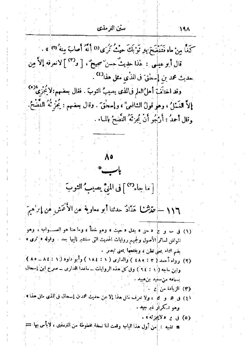 116 - حَدَّثَنَا هَنَّادٌ قَالَ: حَدَّثَنَا أَبُو مُعَاوِيَةَ، عَنْ الأَعْمَشِ، عَنْ إِبْرَاهِيمَ، -[199]- عَنْ هَمَّامِ بْنِ الحَارِثِ، قَالَ: ضَافَ عَائِشَةَ ضَيْفٌ، فَأَمَرَتْ لَهُ بِمِلْحَفَةٍ صَفْرَاءَ، فَنَامَ فِيهَا، فَاحْتَلَمَ، فَاسْتَحْيَا أَنْ يُرْسِلَ بِهَا وَبِهَا أَثَرُ الِاحْتِلَامِ، فَغَمَسَهَا فِي المَاءِ، ثُمَّ أَرْسَلَ بِهَا، فَقَالَتْ عَائِشَةُ: «لِمَ أَفْسَدَ عَلَيْنَا ثَوْبَنَا؟ إِنَّمَا كَانَ يَكْفِيهِ أَنْ يَفْرُكَهُ بِأَصَابِعِهِ، وَرُبَّمَا §فَرَكْتُهُ مِنْ ثَوْبِ رَسُولِ اللَّهِ صَلَّى اللَّهُ عَلَيْهِ وَسَلَّمَ بِأَصَابِعِي»، هَذَا حَدِيثٌ حَسَنٌ صَحِيحٌ " وَهُوَ قَوْلُ غَيْرِ وَاحِدٍ مِنْ أَصْحَابِ النَّبِيِّ صَلَّى اللَّهُ عَلَيْهِ وَسَلَّمَ، -[200]- وَمَنْ بَعْدَهُمْ مِنَ الفُقَهَاءِ مِثْلِ: سُفْيَانَ، وَأَحْمَدَ، وَإِسْحَاقَ، قَالُوا: فِي المَنِيِّ يُصِيبُ الثَّوْبَ يُجْزِئُهُ الفَرْكُ وَإِنْ لَمْ يُغْسَلْ " وَهَكَذَا رُوِيَ عَنْ مَنْصُورٍ، عَنْ إِبْرَاهِيمَ، عَنْ هَمَّامِ بْنِ الحَارِثِ، عَنْ عَائِشَةَ، مِثْلَ رِوَايَةِ الأَعْمَشِ، وَرَوَى أَبُو مَعْشَرٍ هَذَا الحَدِيثَ، عَنْ إِبْرَاهِيمَ، عَنْ الأَسْوَدِ، عَنْ عَائِشَةَ، وَحَدِيثُ الأَعْمَشِ أَصَحُّ